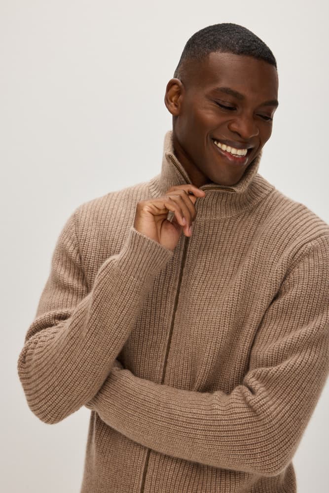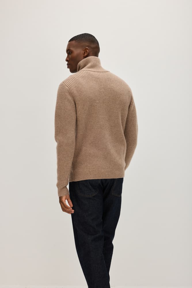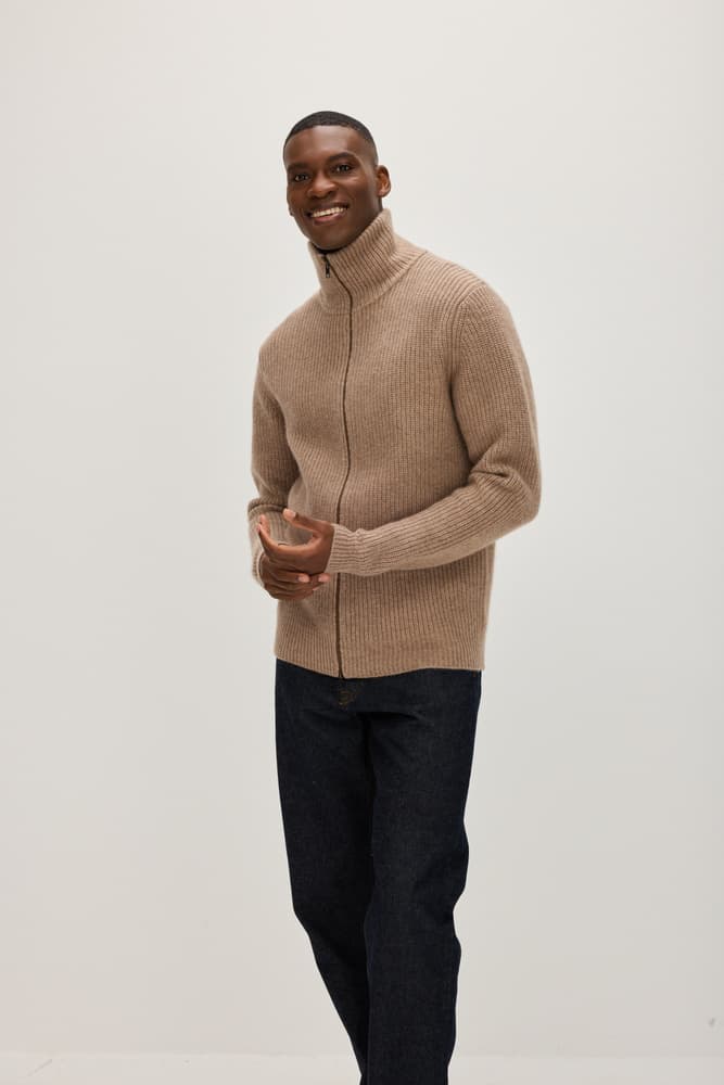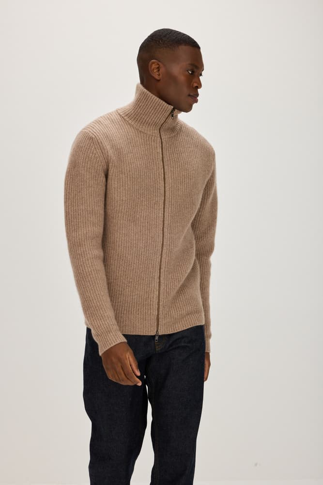 Ribstrikket striktrøje med lynlås foran. Ribstrikkede håndledsvarmere forneden og i ærmekanterne. Dobbeltstrikket, højere krave, der fungerer lige så godt stående som liggende over skuldrene. Lommer foran.