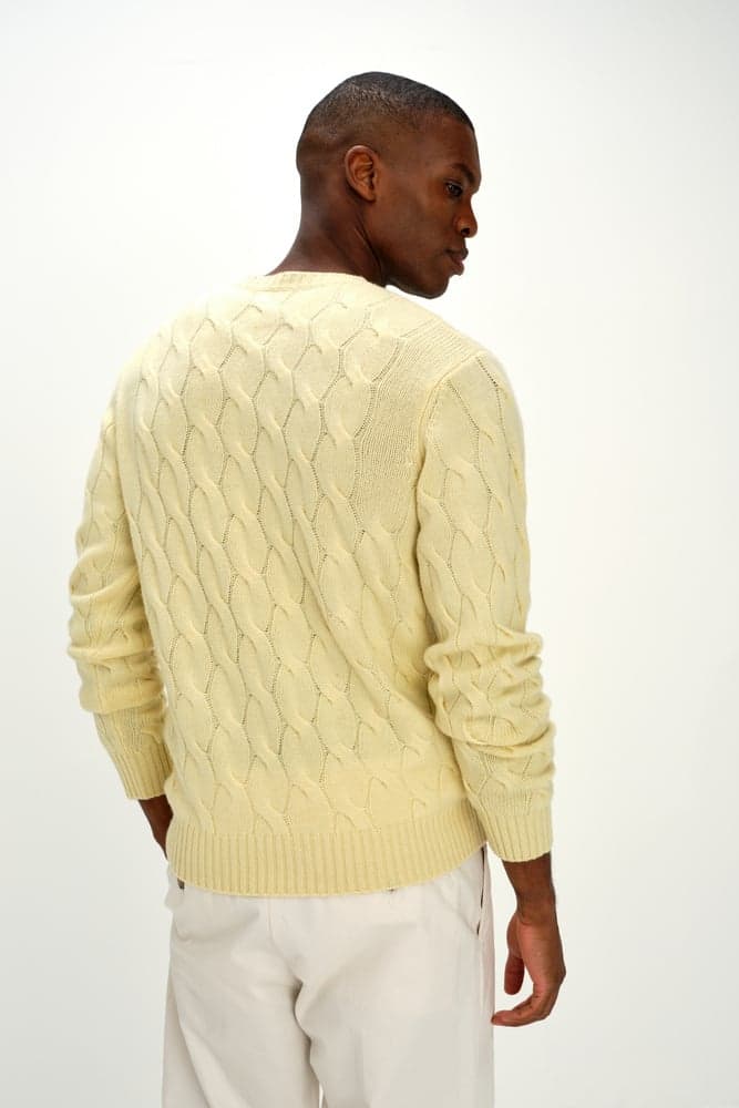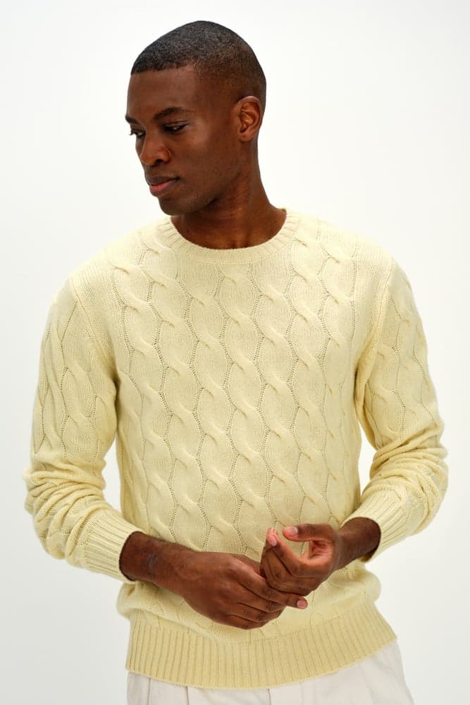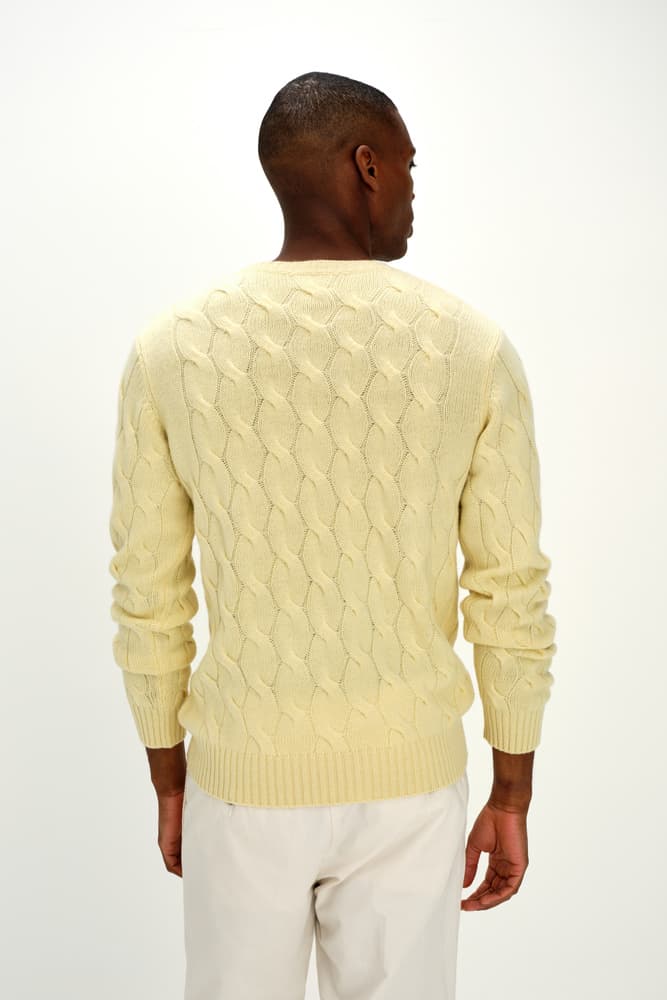 Strikket trøje med et firkantet snit og et bredt kabelmønster. Bred pasform med lange ærmer og forlængede skuldre. Rund halsudskæring. Elastiske manchetter og forneden.