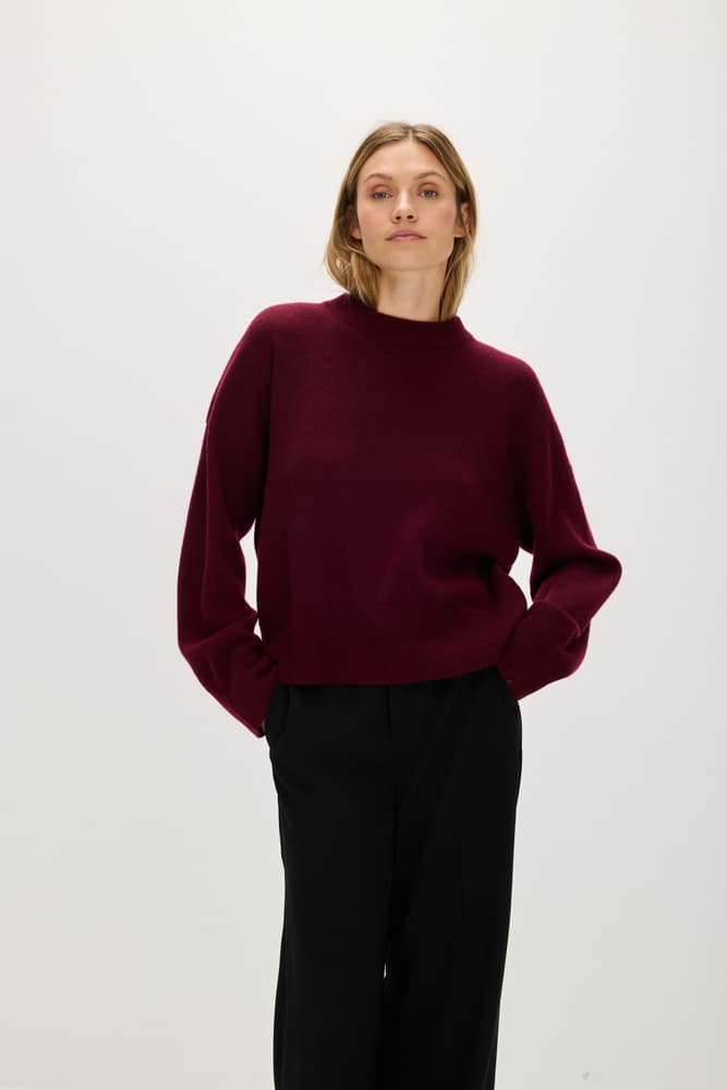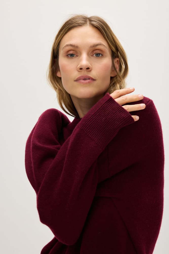 Glatstrikket trøje med firkantet snit. Bred pasform med lange ærmer og forlængede skuldre. Rund halsudskæring. Ribstrikning ved ærmeenderne og forneden.