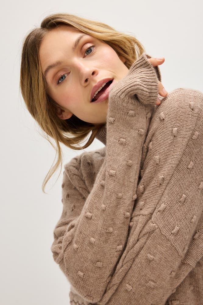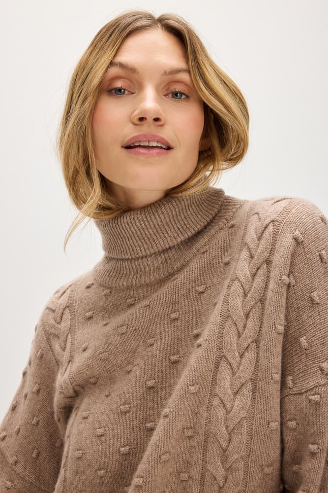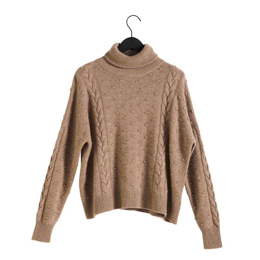 An oversized turtleneck sweater with cable and dotted patterns. The sweater is wide over the body, but is slightly tighter over the arms. The body has a row of cables going down on each side, and the arms has a row of cables going down the middle. The dotted pattern is over the rest of the sweater.