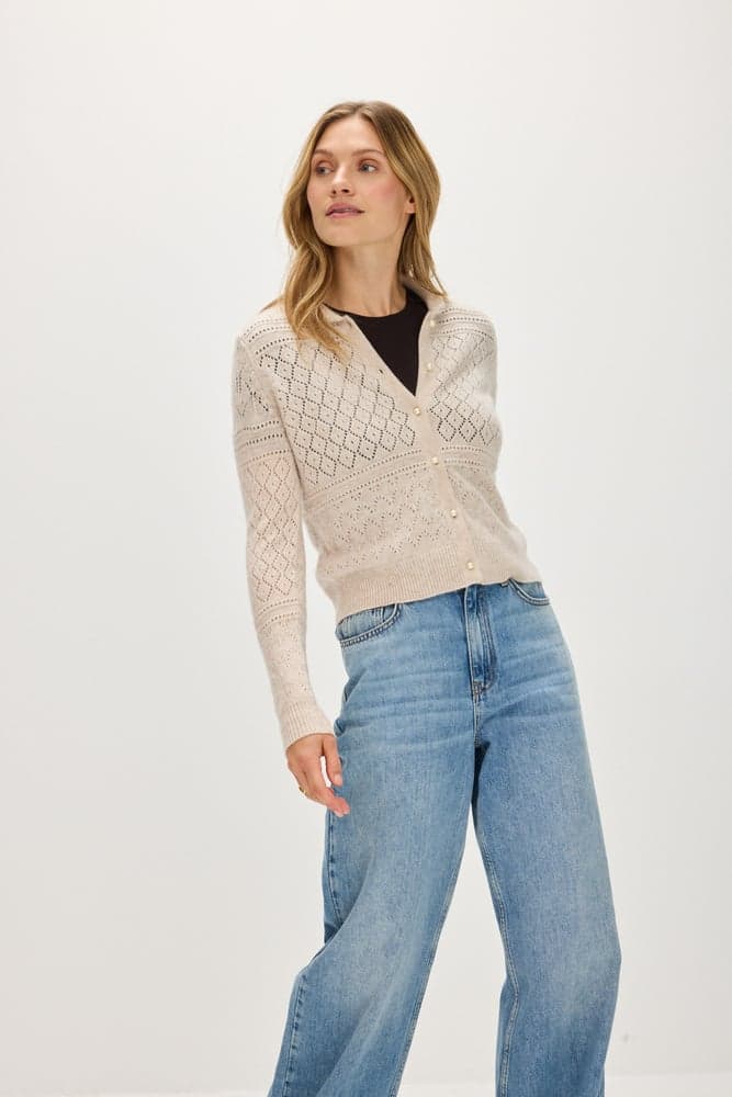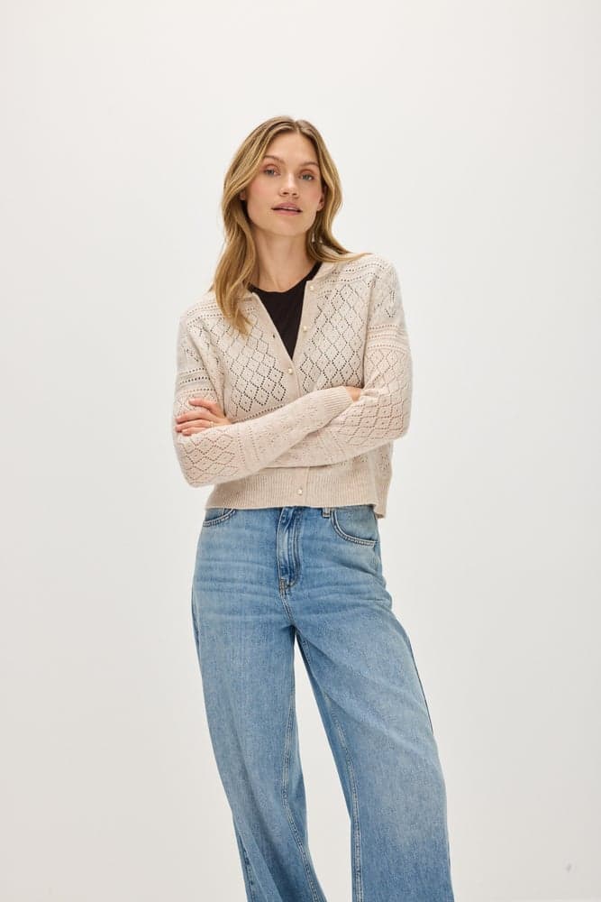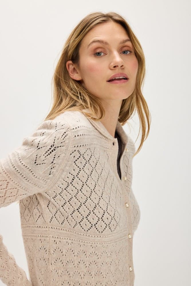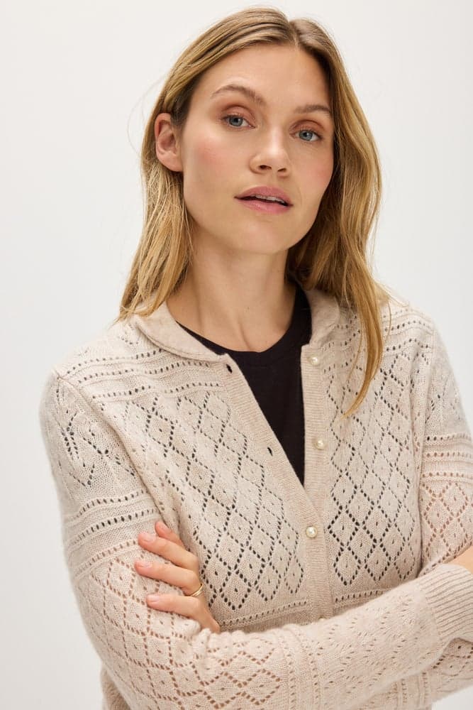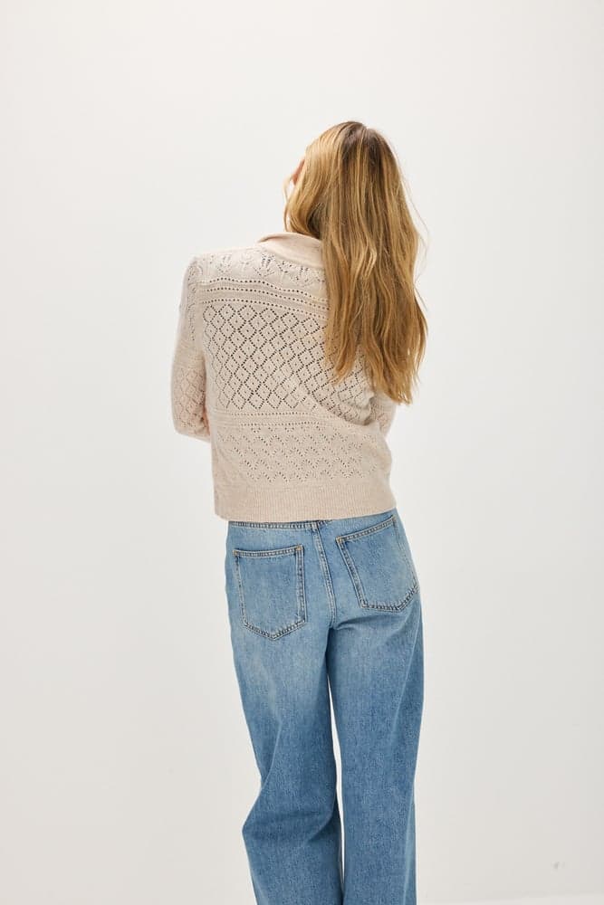 Knitted cardigan with a shirt collar and a lace knitted pattern. Short design and body hugging fit.