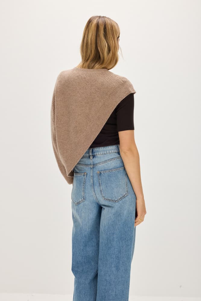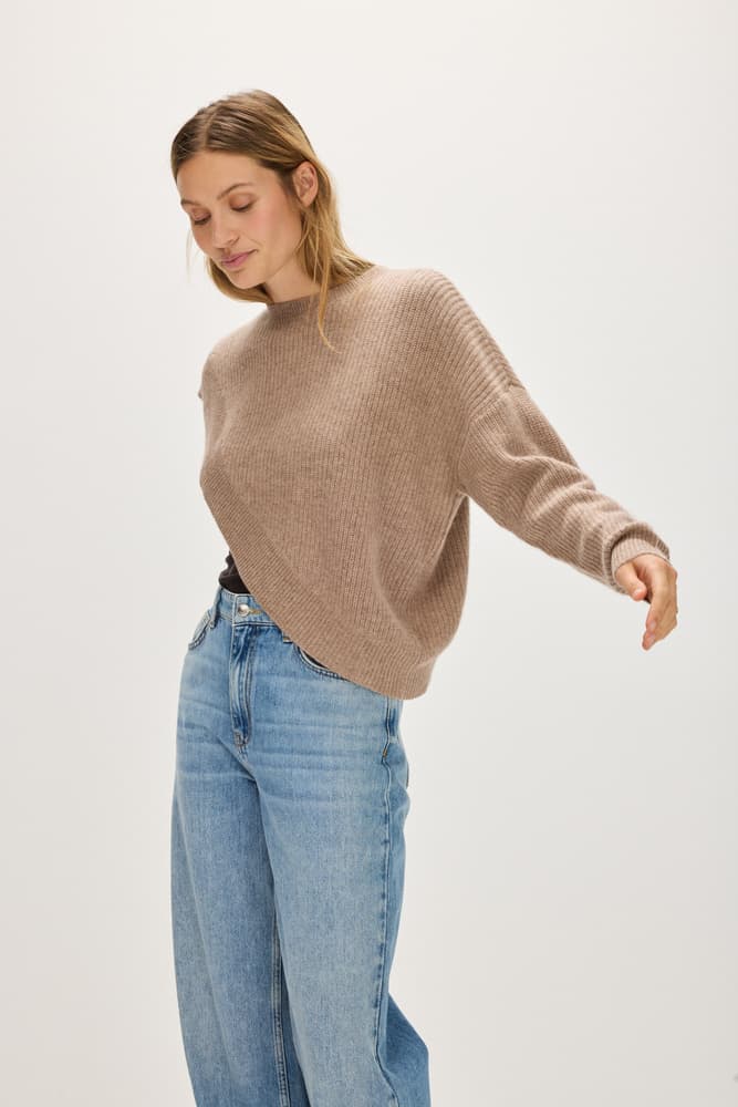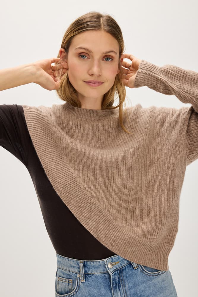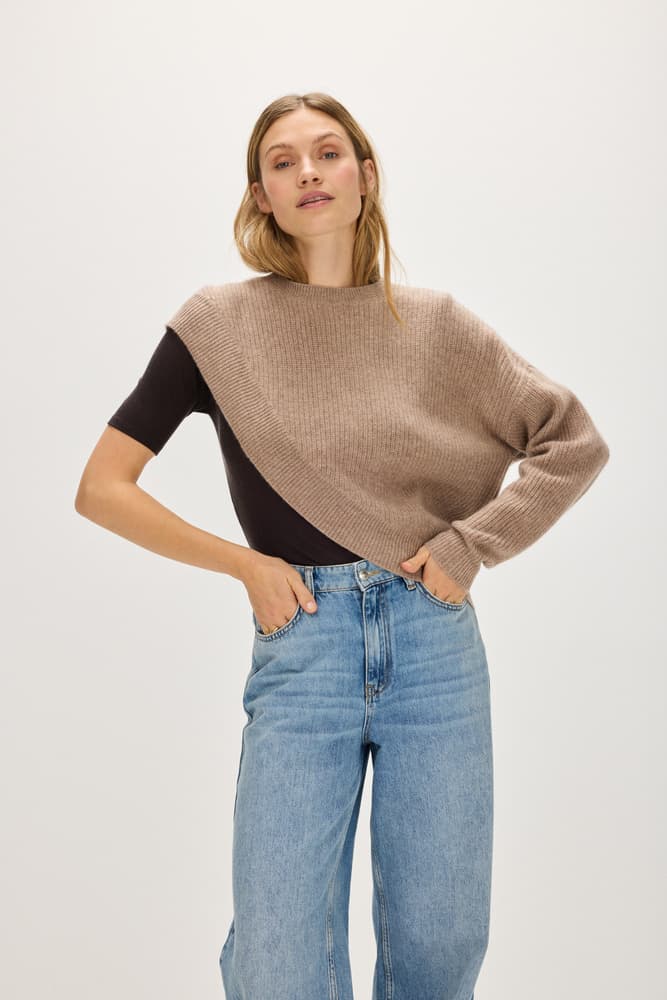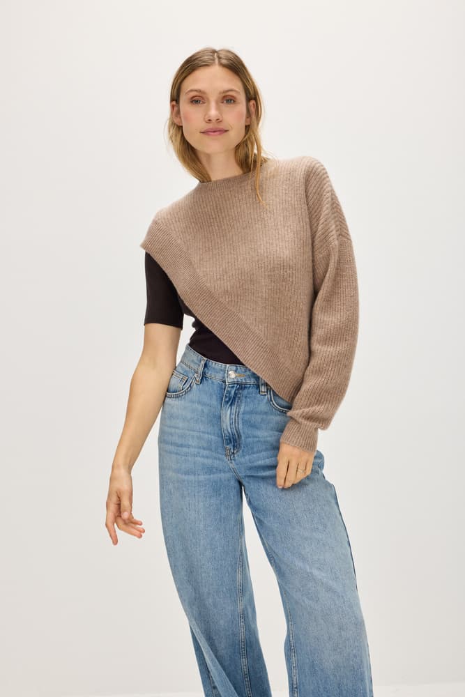 Asymmetrisk trøje med ærme. Trøjen er ribstrikket og er figursyet. Perfekt til både fest og hverdag.