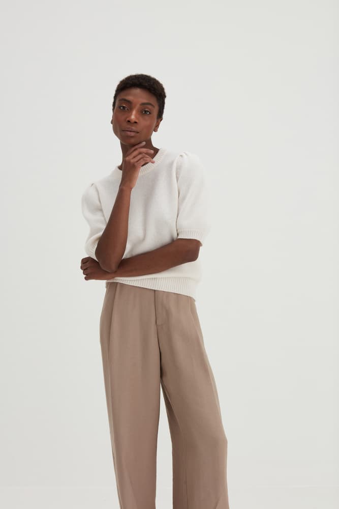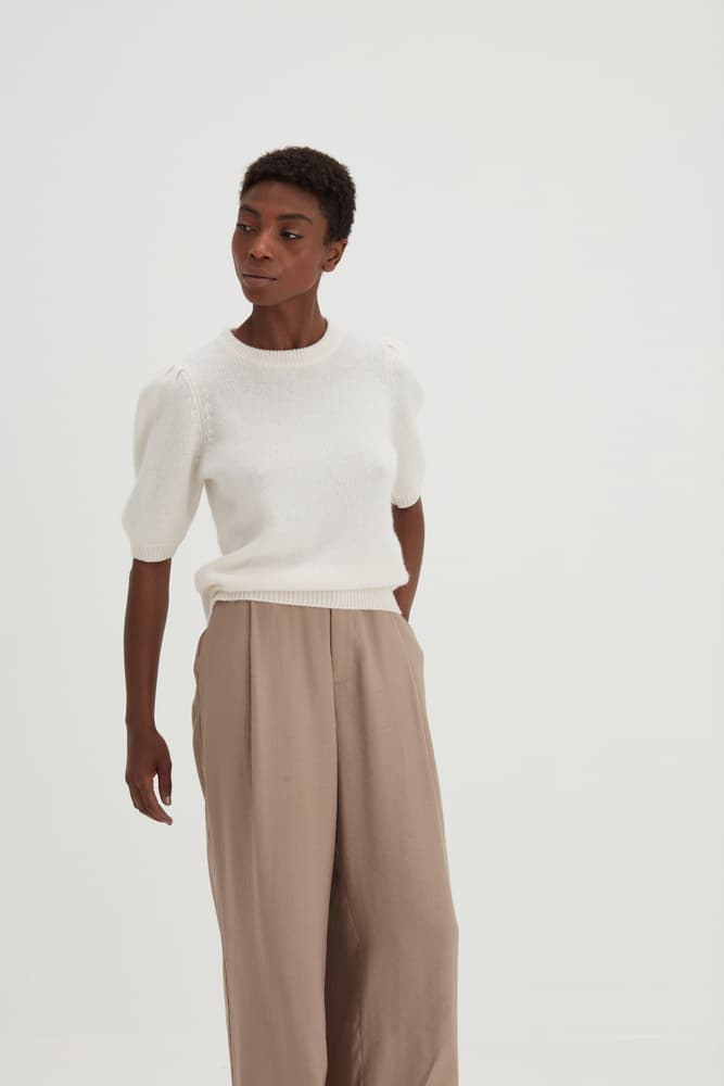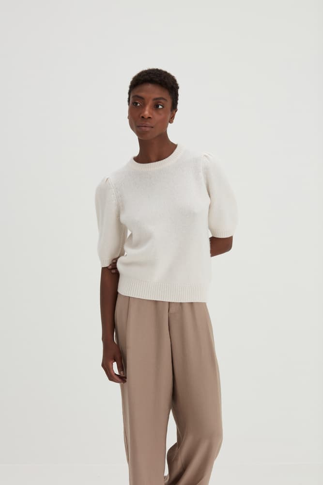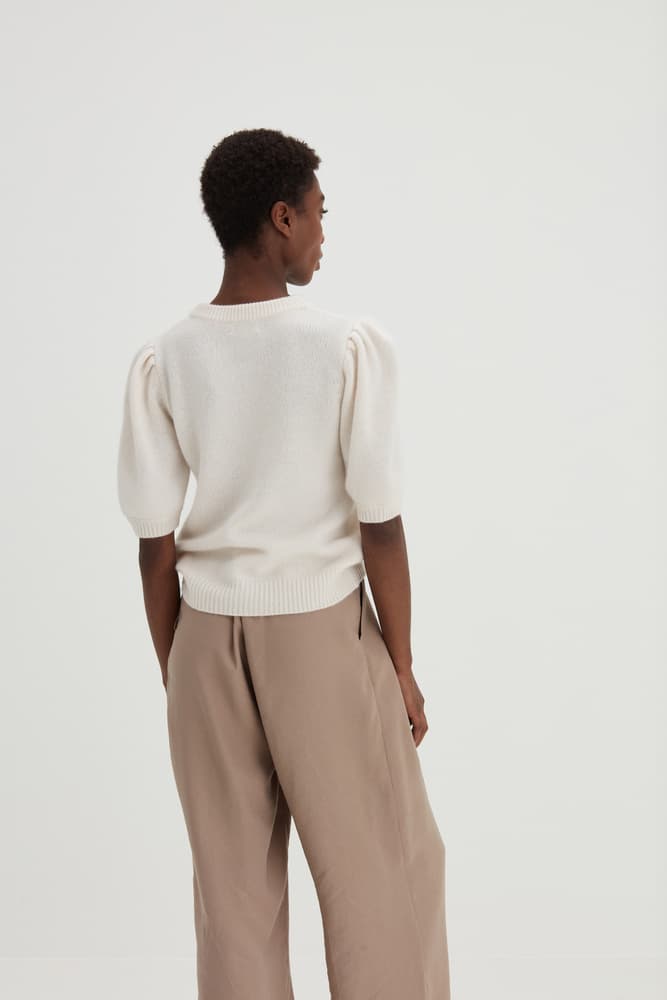Groft strikket trøje med korte ærmer. Trøjen har pufdetaljer på skulderpartiet med elastiske åbninger. Noget kortere model med elastik forneden. Rund hals.