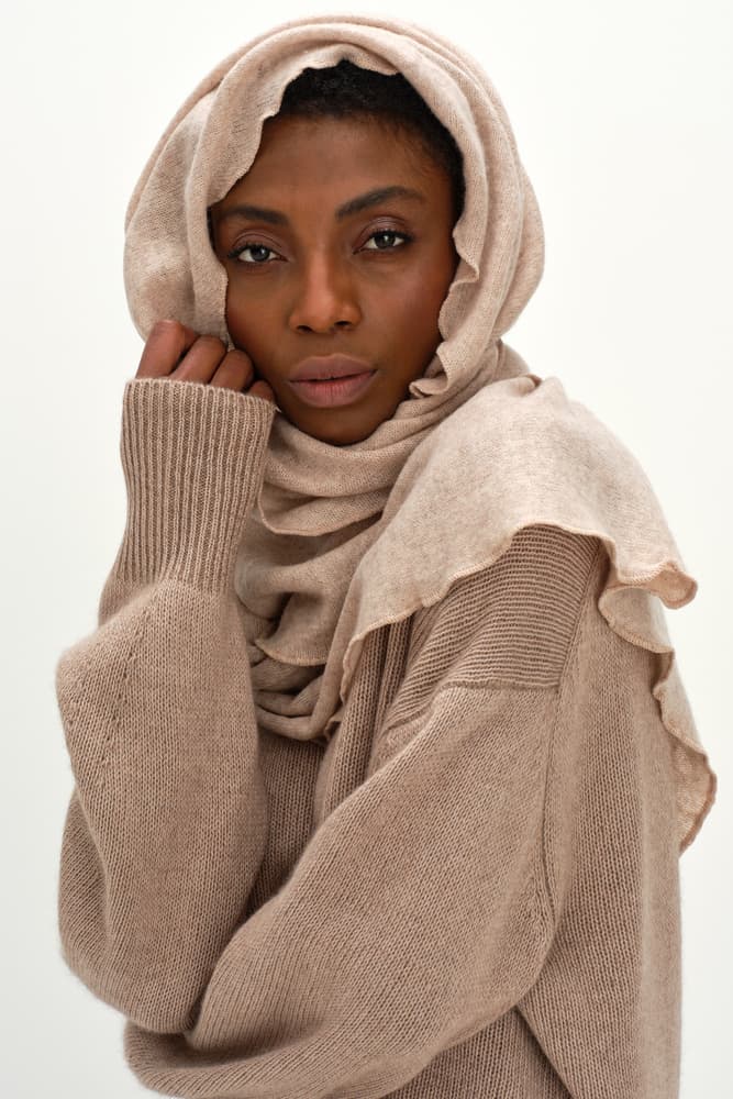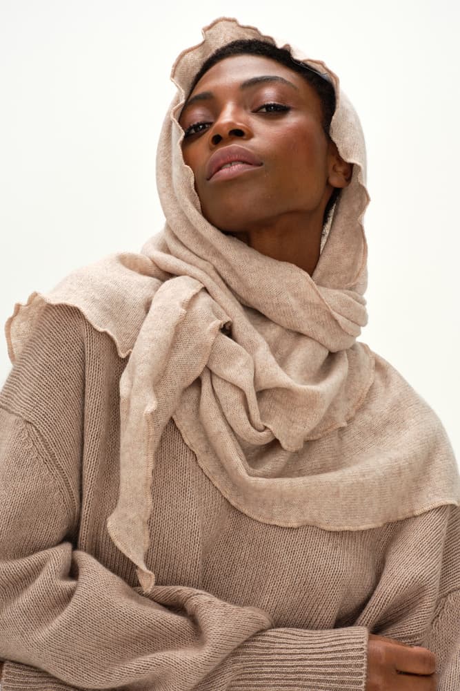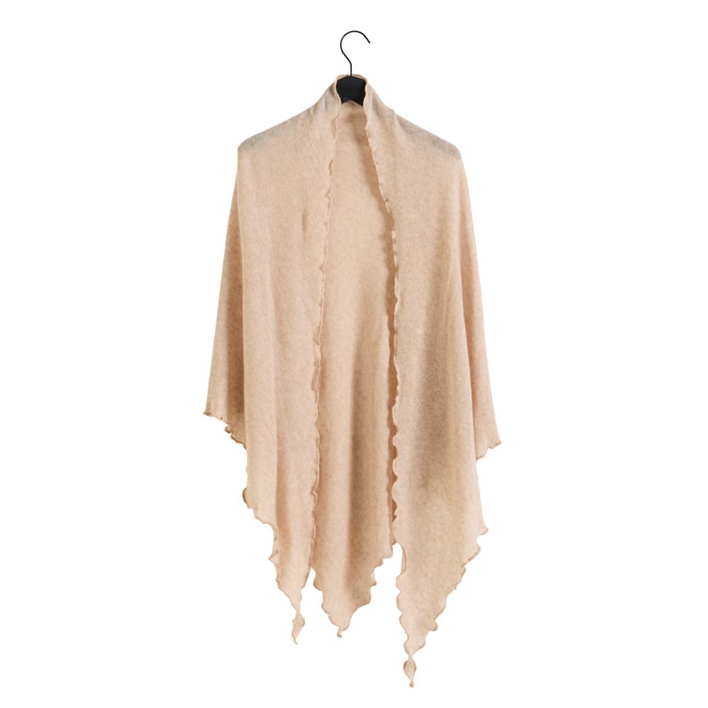 Dette trekantede tørklæde er glatstrikket og tyndere i modellen. Det har desuden en detaljeret bølget kant. Tørklædet er det perfekte tilbehør til efterår og vinter.