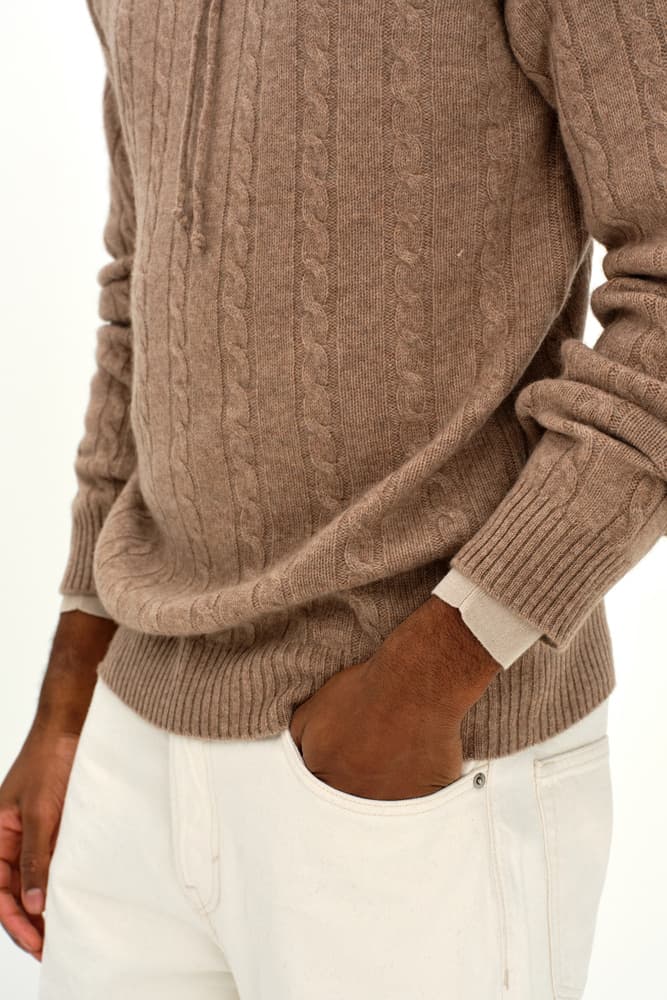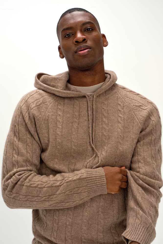 A plain knit hoodie with a drawstring and front pocket - and now with cable knit. A cable knit all around, a bit longer, but has a standard fit. Match with a pair of jeans for a relaxed look. With this hoodie and a pair of our Pants Pocket, you'll have an outfit so comfortable you never want to take it off!