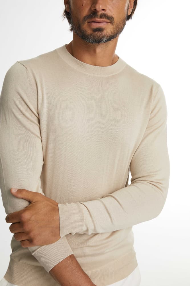 This is the perfect o-neck for summer. With a rounded neckline and ribbed hems around the neck, arms, and lower edges, in a mix of silk/cashmere. This plain men's o-neck is a must in every man's wardrobe. True to size and fit.