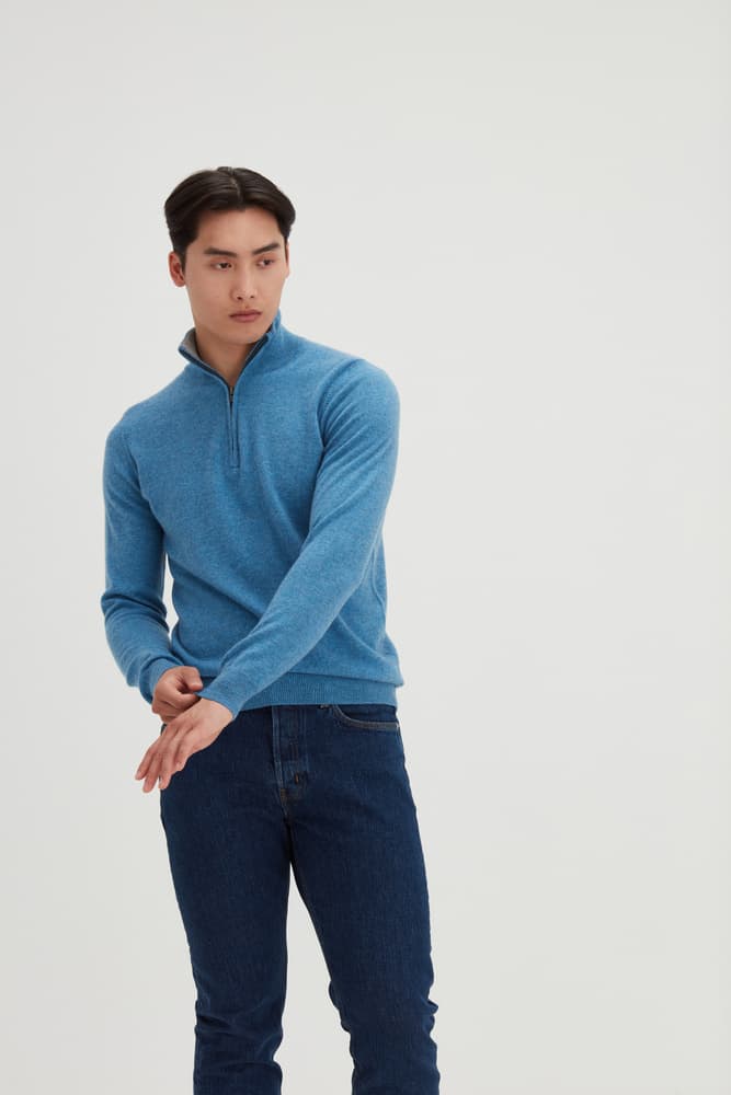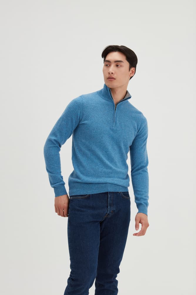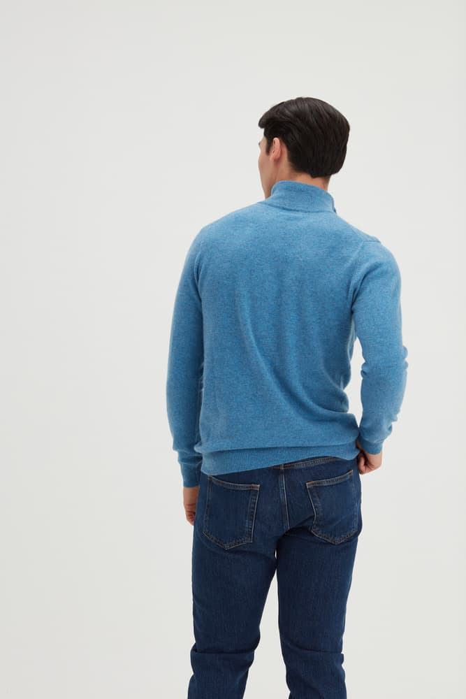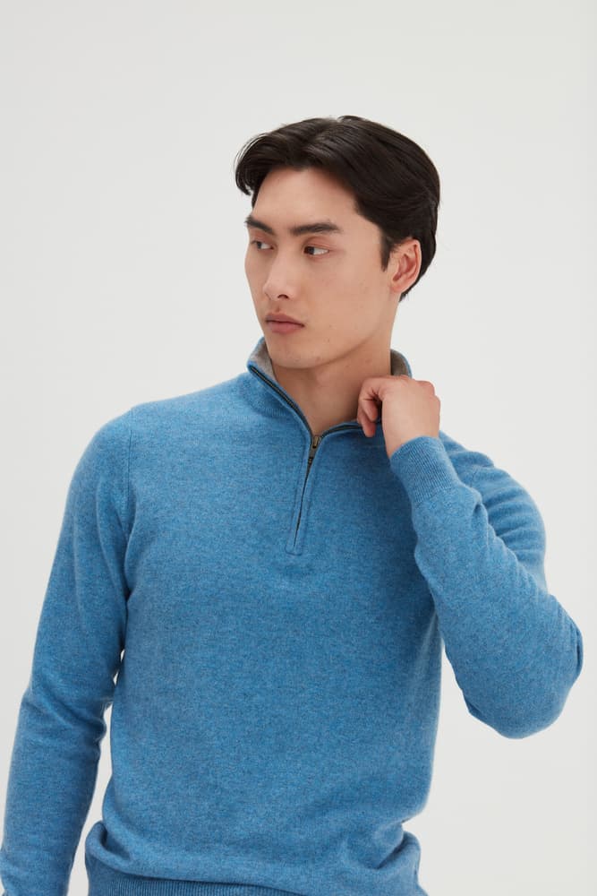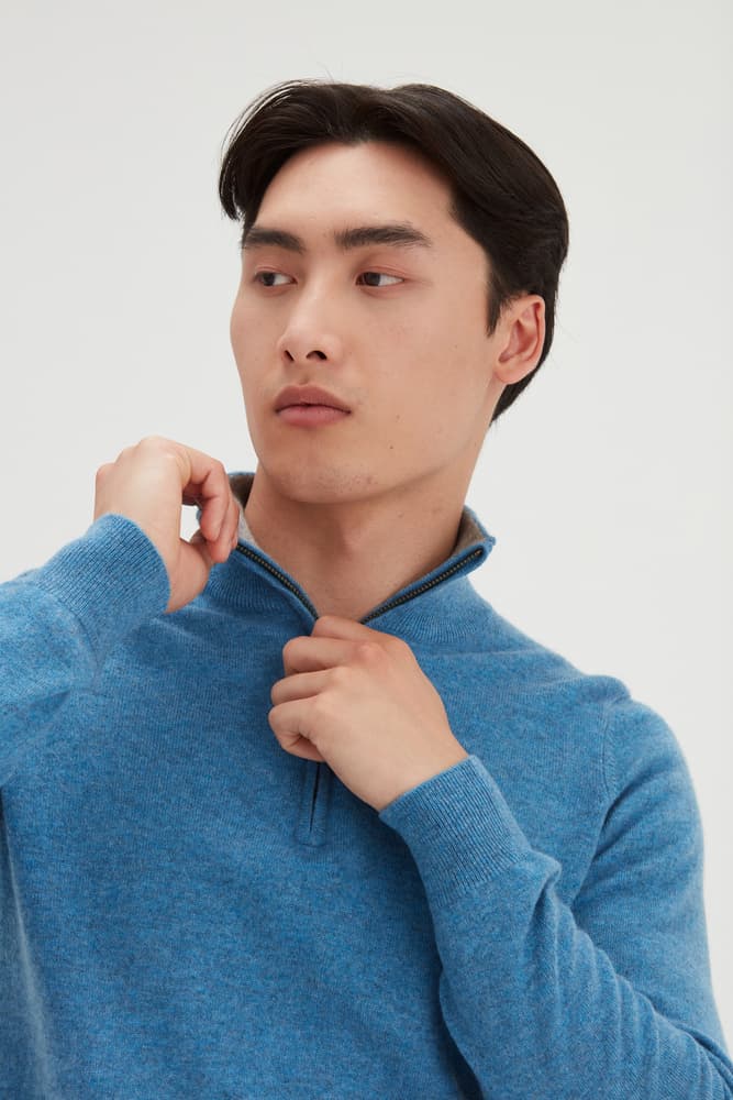 Glattstrikket genser med kort glidelås øverst. Skiftende farge på innsiden av kragen. Ribbekant både ved ermeåpningene og i nederkant. Normal i størrelse og passform.