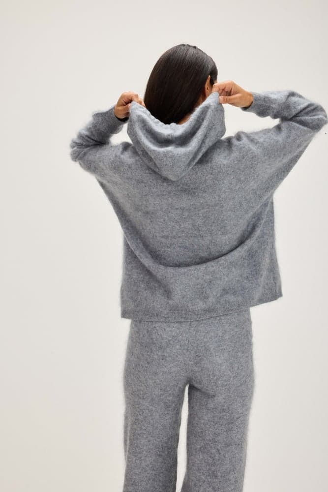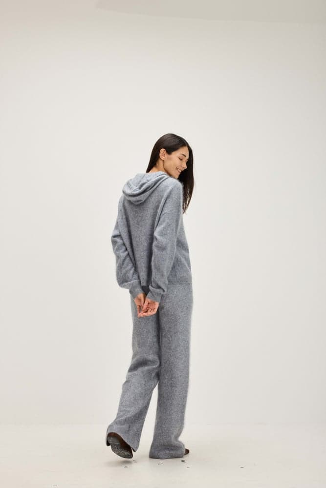 The brushed cashmere version of our flat-knitted high-waisted trousers with ribbed hem. Wide long legs.