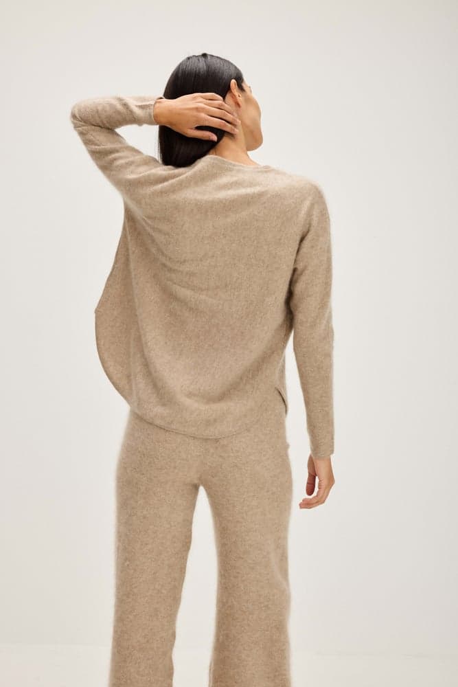 The brushed cashmere version of our flat-knitted high-waisted trousers with ribbed hem. Wide long legs.