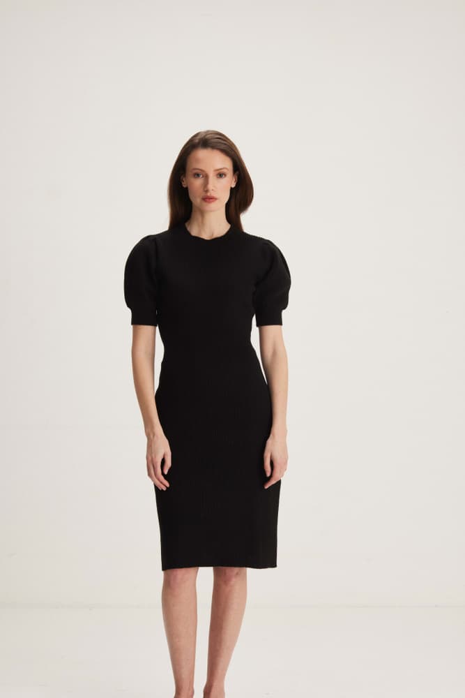 Ribbed dress with long puff sleeves. Rib knit elastic at the waist. The dress has an opening along one side at the bottom. The fit is figure-hugging. Long ribbed cuffs and a round neck.