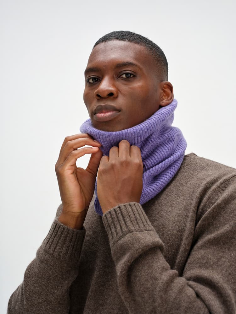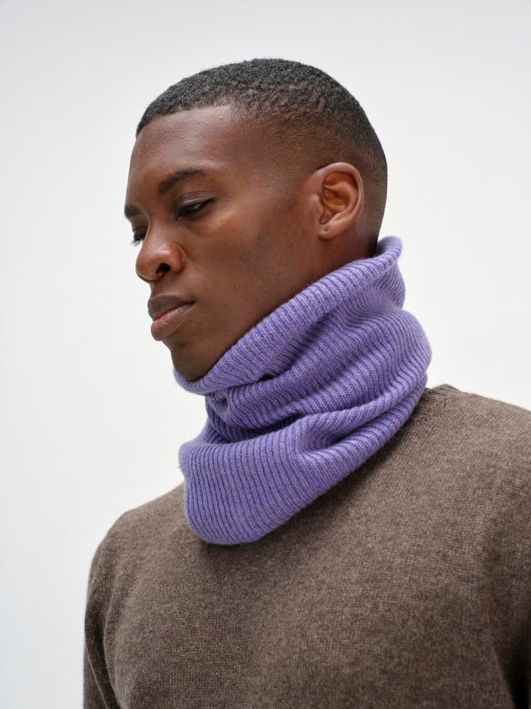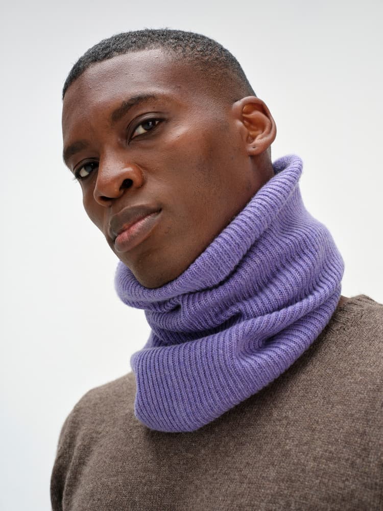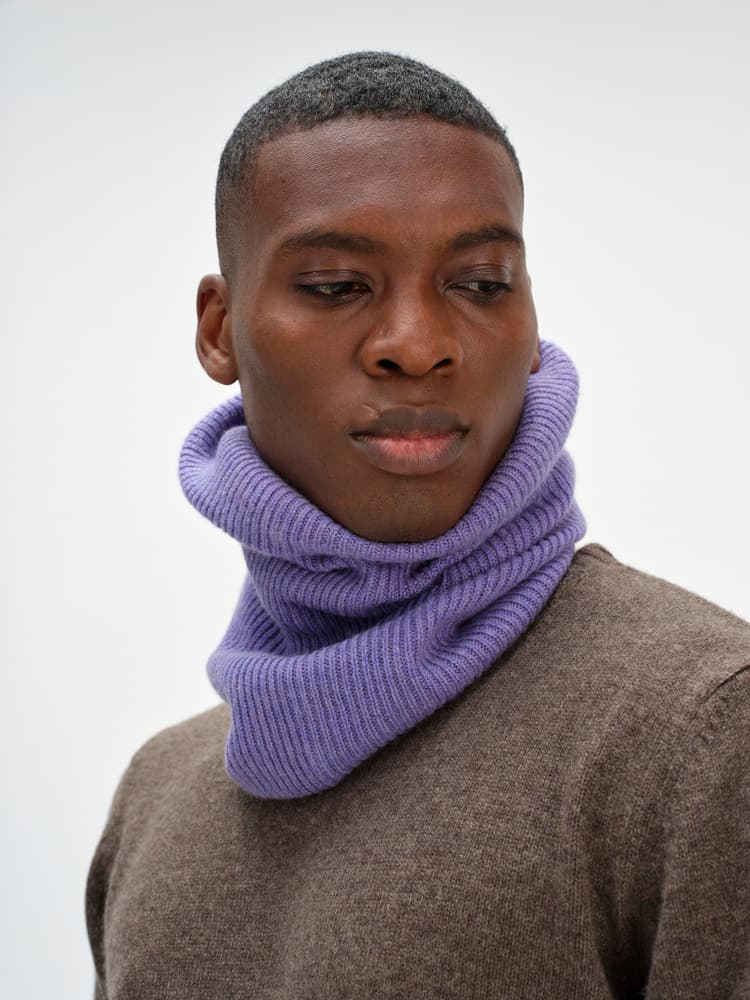 Ribbestrikket buff. Strikket i doble lag og kan brukes på begge sider.