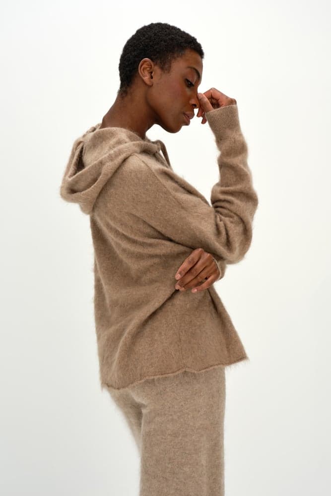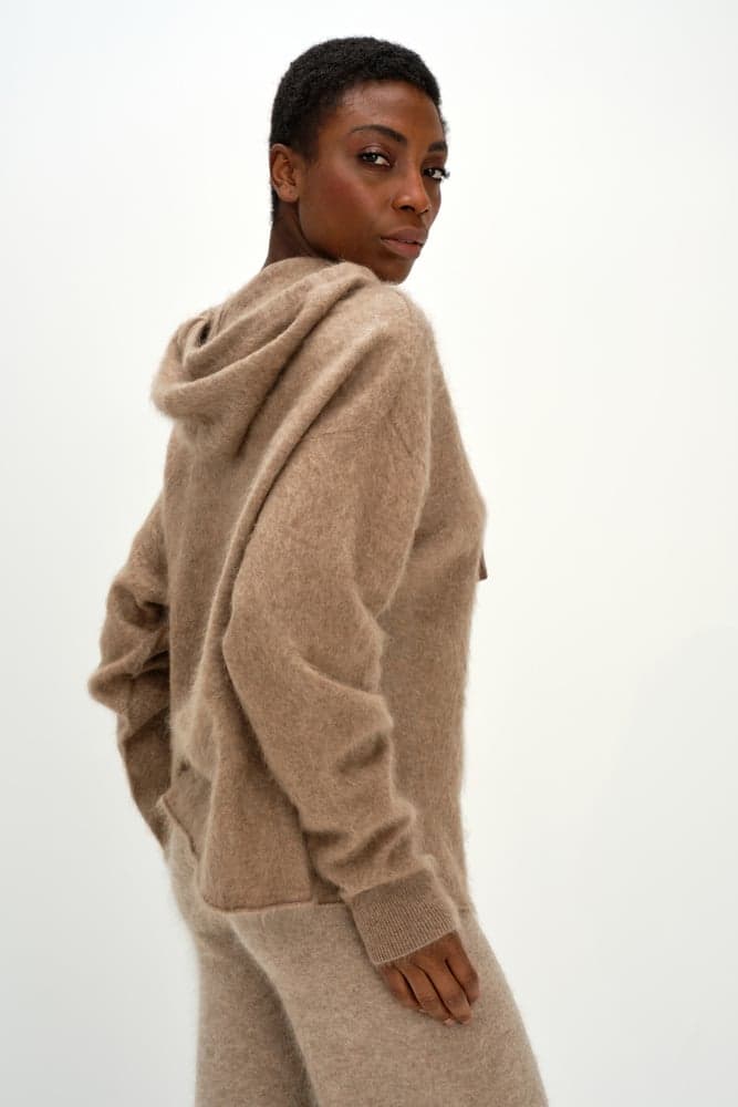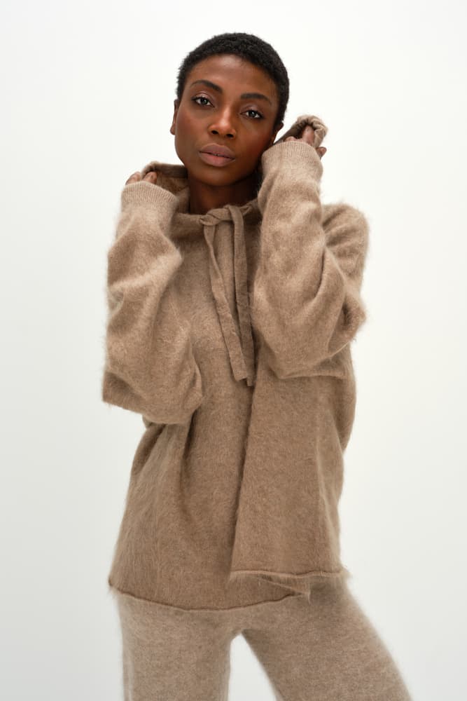 Hoodie made using full needle-knitting, but now made with 100% brushed cashmere. Oversize fit with dropped shoulder. Long sleeves with cuffs. Wide laces. Looks lovely paired with Sporty shorts.