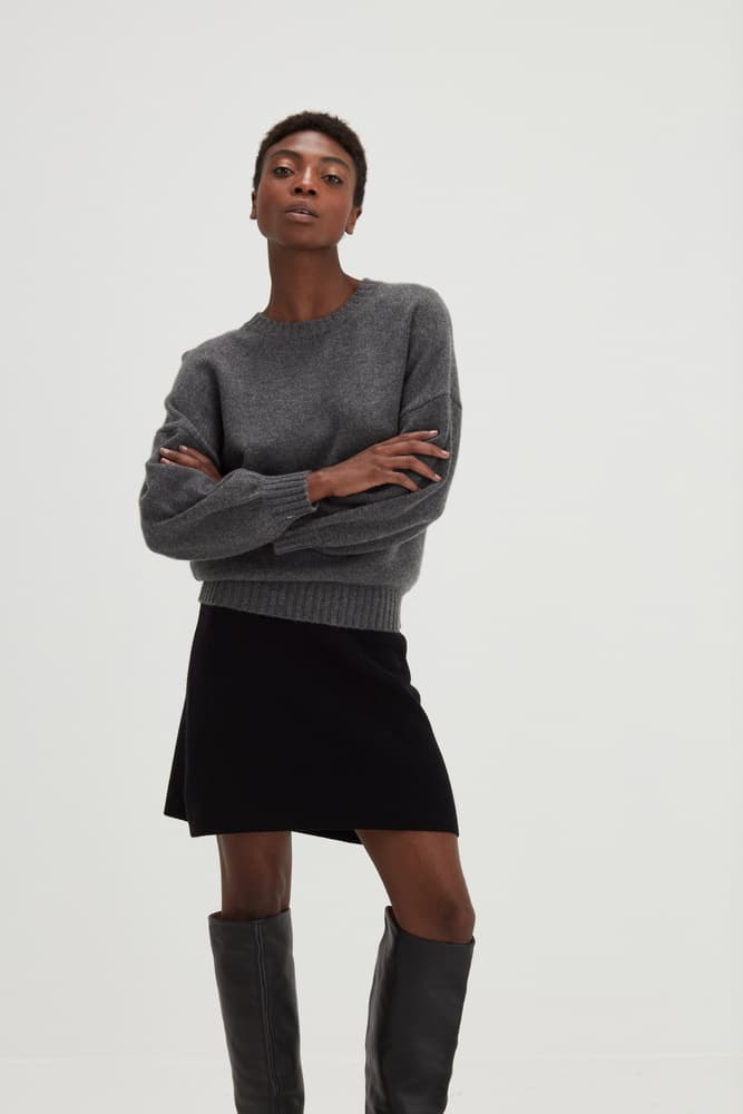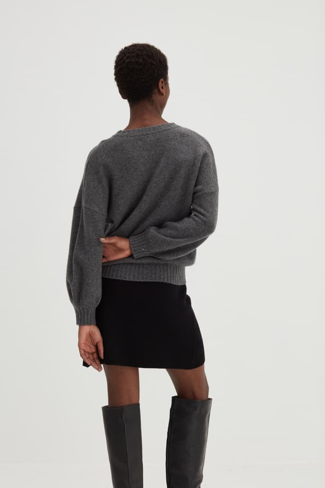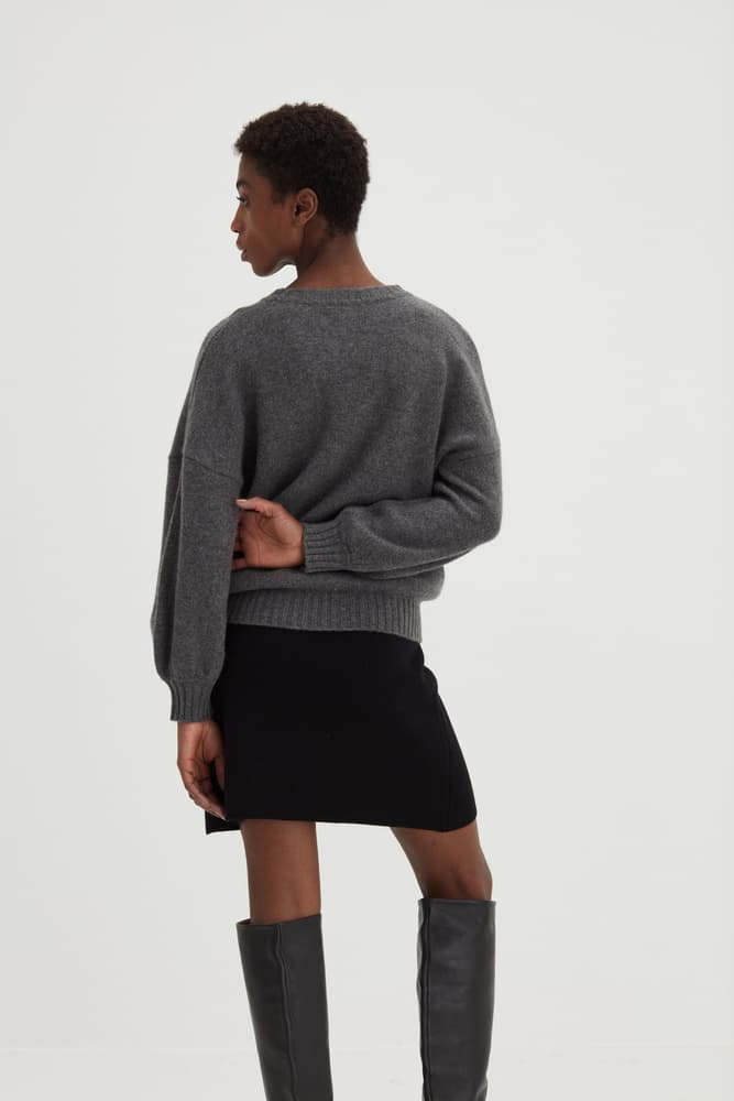 Rundhalset genser med 3/4 ermer. Volum i ermene. Strikk i nederkant, halsringning og nederst på ermene.