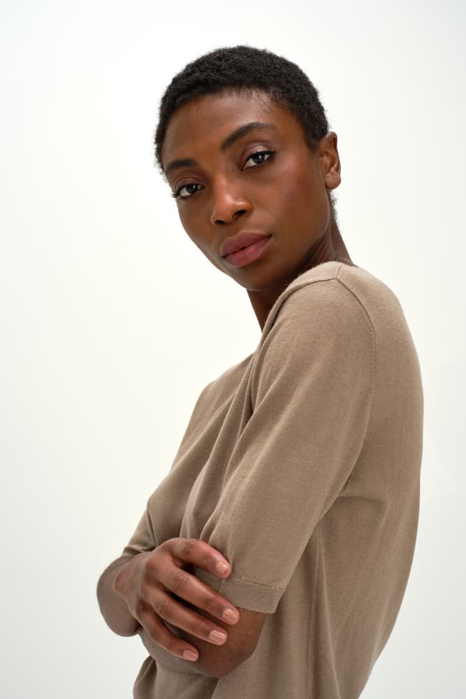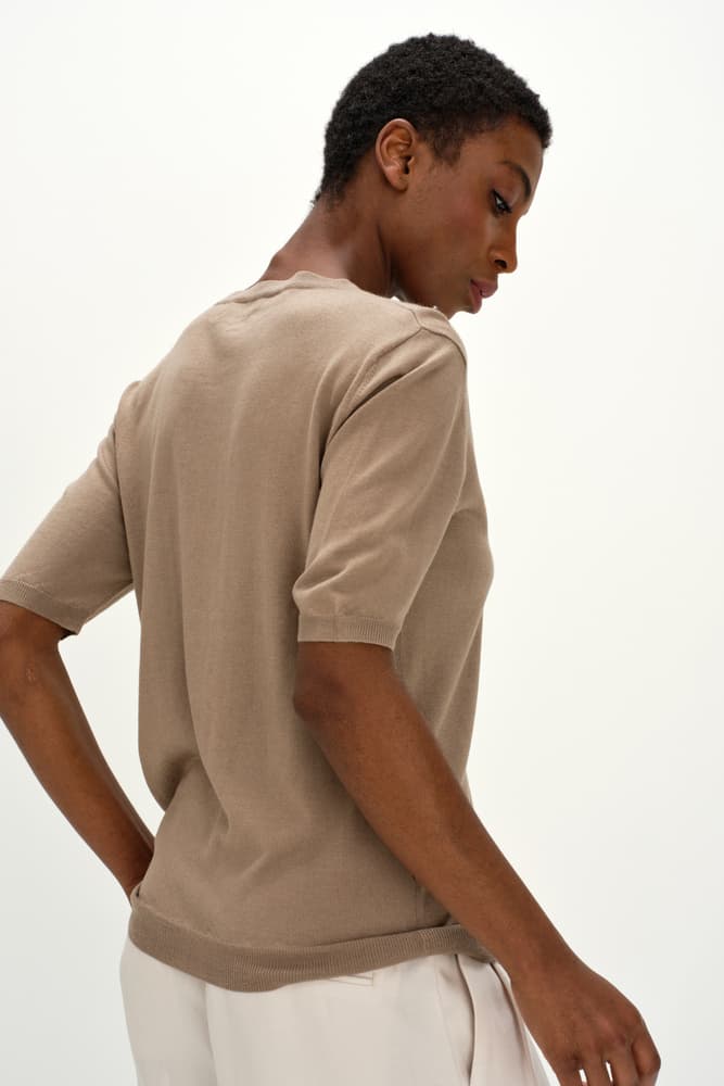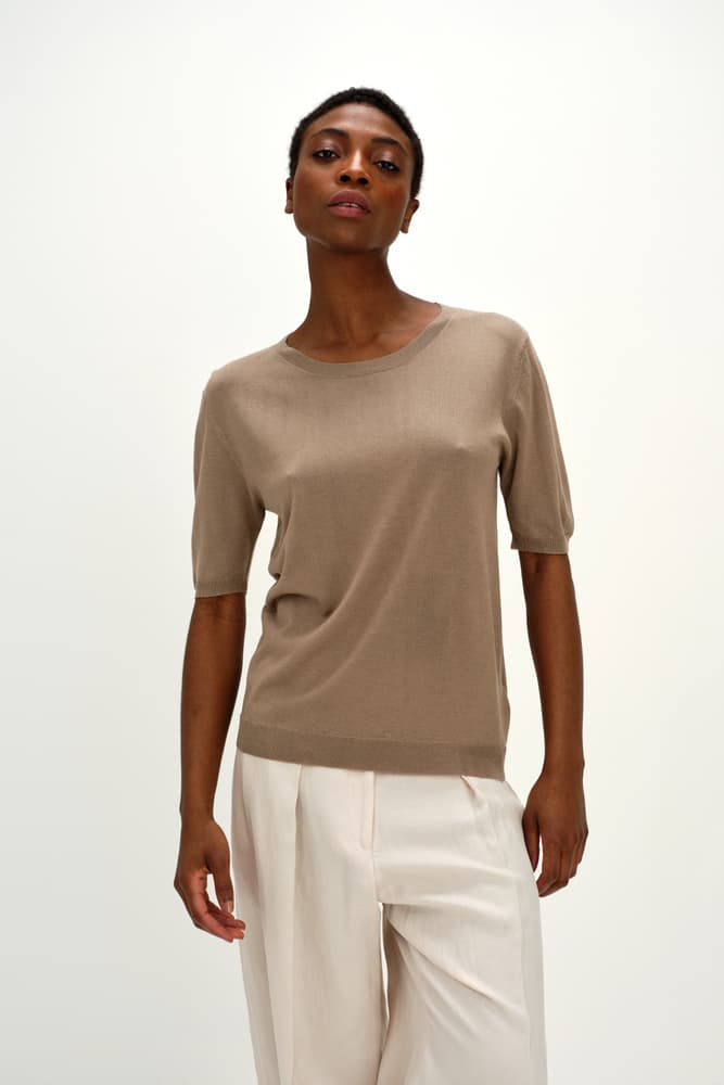 Klassisk T-skjorte i en tynn, herlig silke- og kasjmirblanding. Rund halsringning og korte ermer. Små splitter i sidene og en kroppsnær fasong.