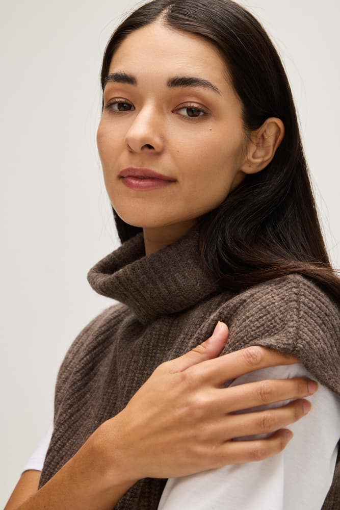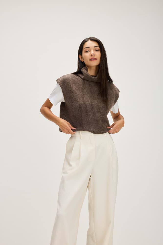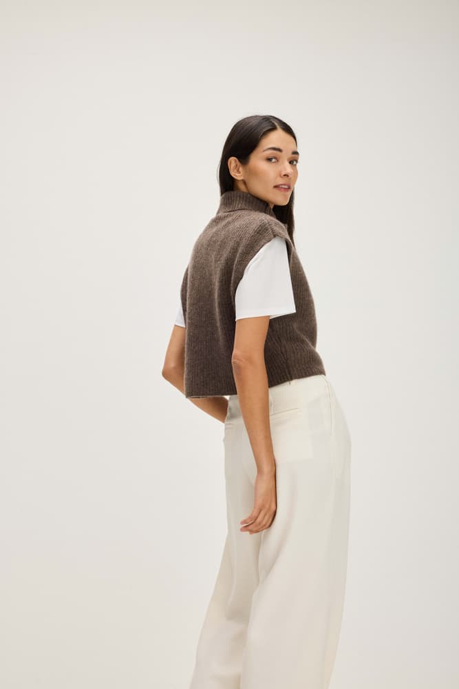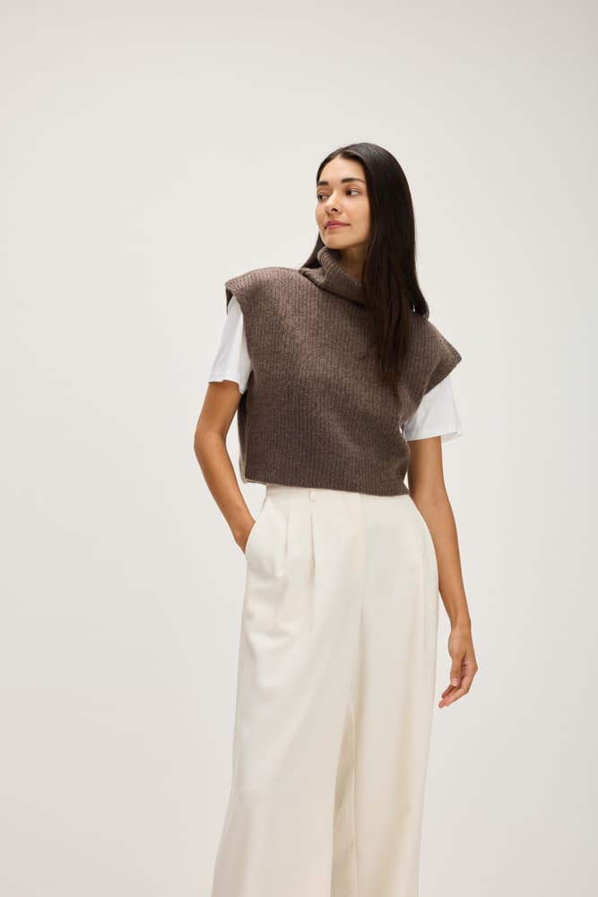 A waist-length vest with ribbed knitting and a turtleneck.