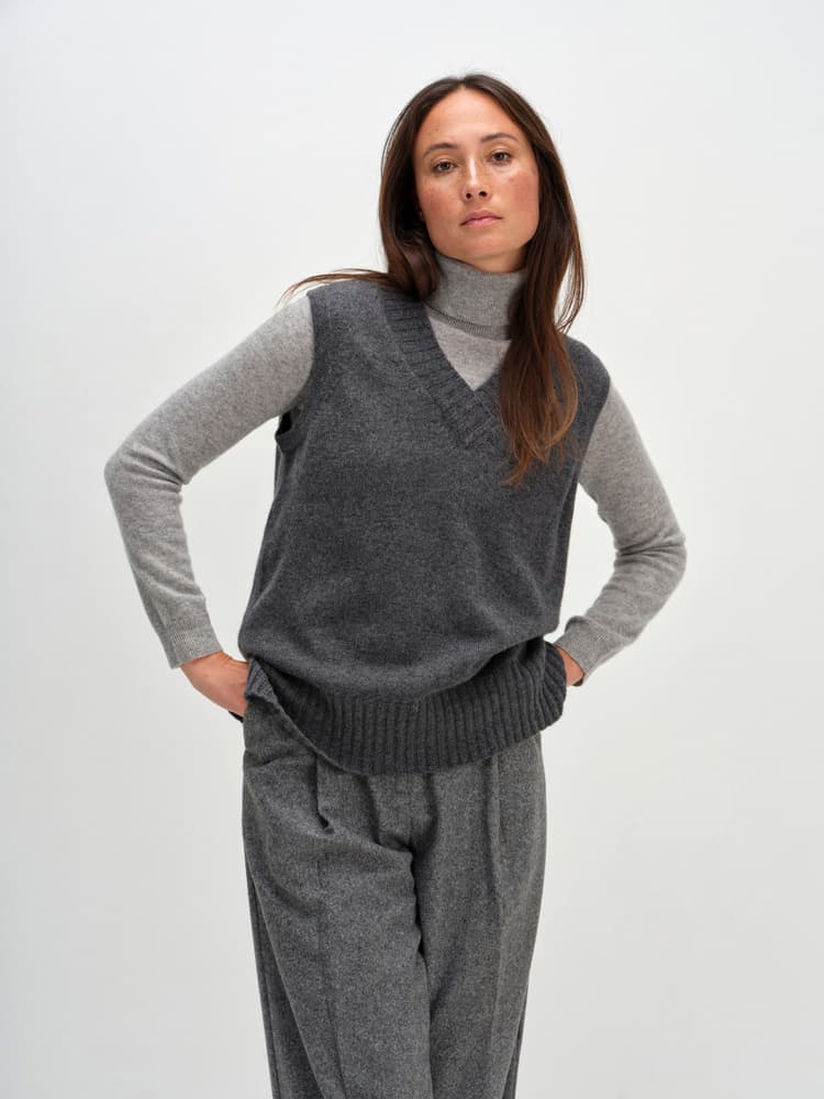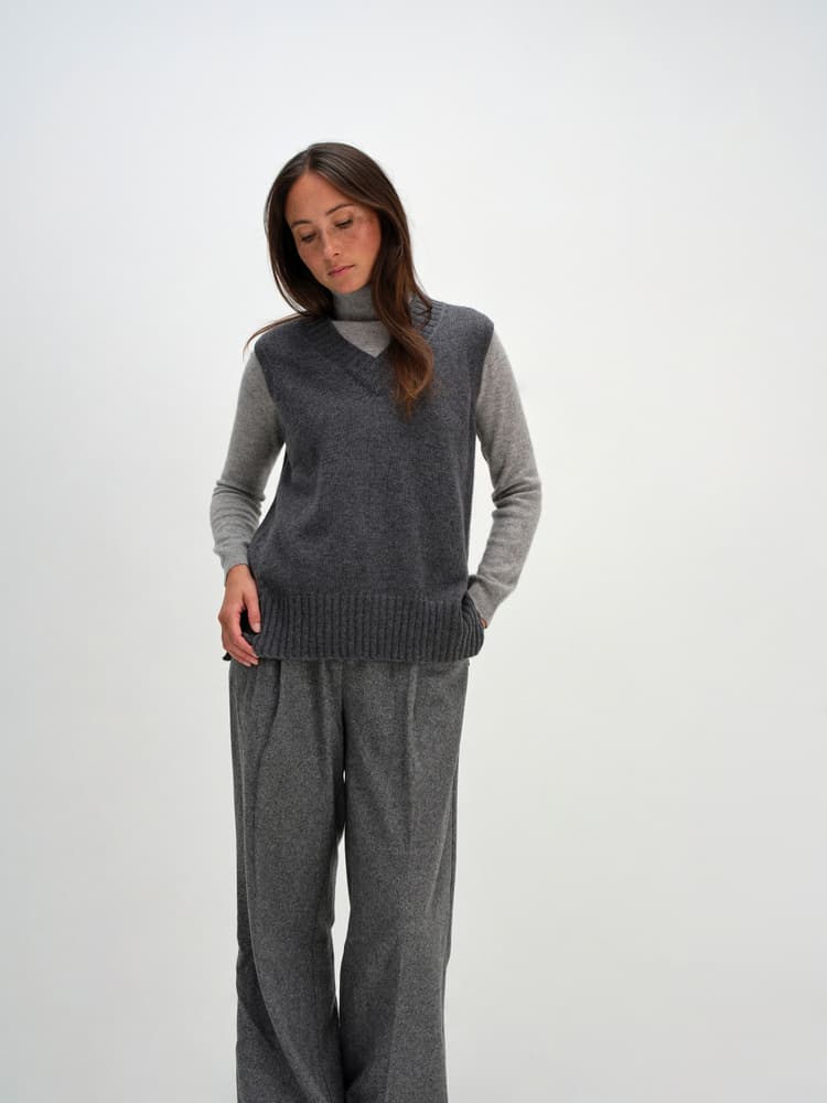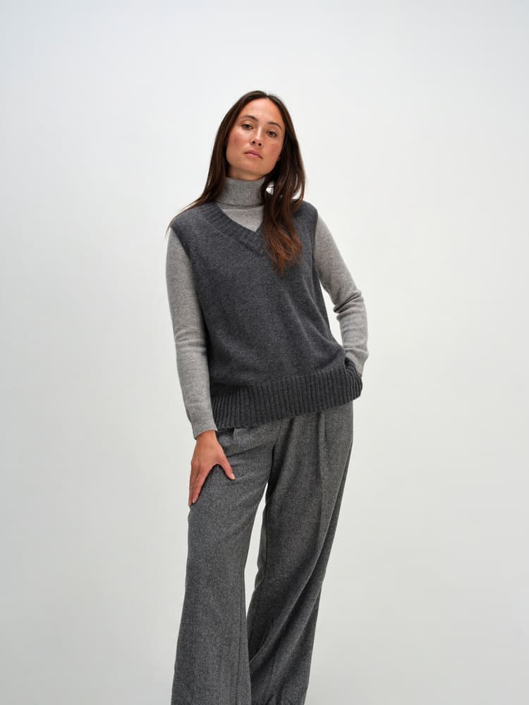 V-ringet vest med fine detaljer. Dekorativ halsparti med omslag og brede ribbedetaljer. Ribbekant nederst og splitt i begge sidene.