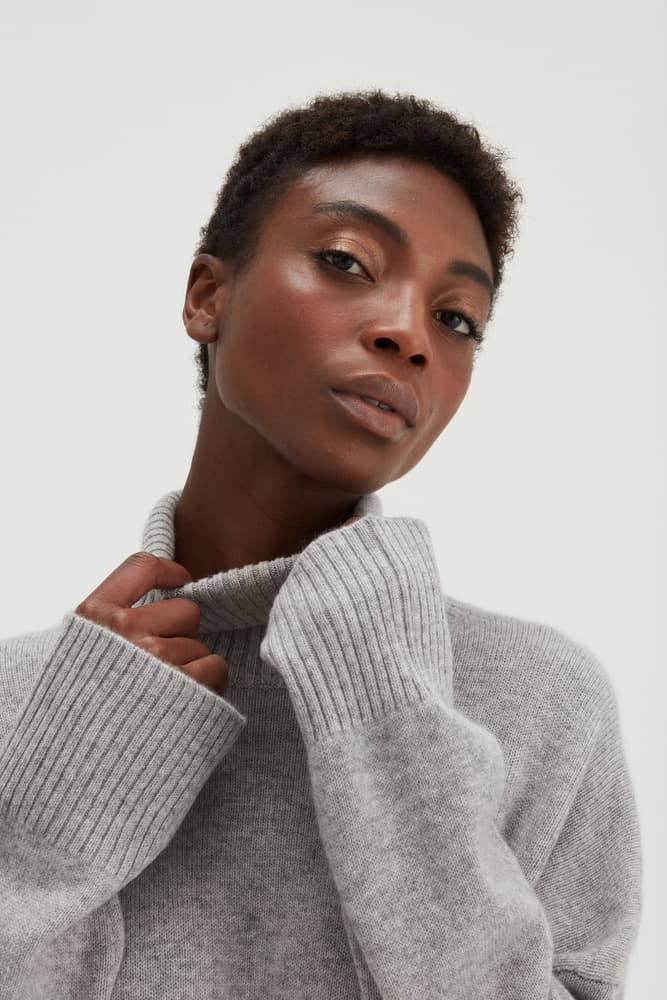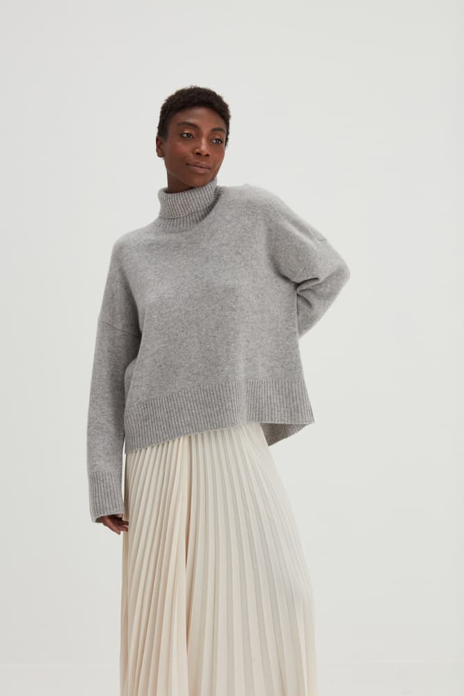 Strikket genser i en oversized modell. Elastisk strikket nederst på ermene og i nederkant samt høy og elastisk strikket polokrage. Forlenget skulder. Modellen er litt lengre og avrundet bak.