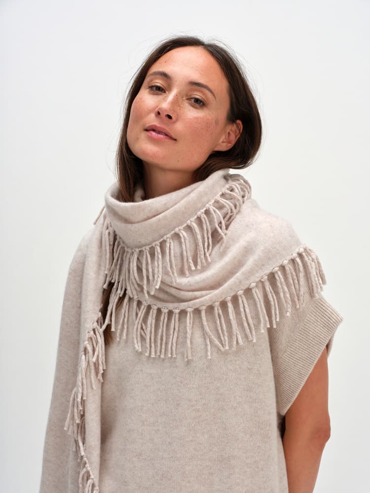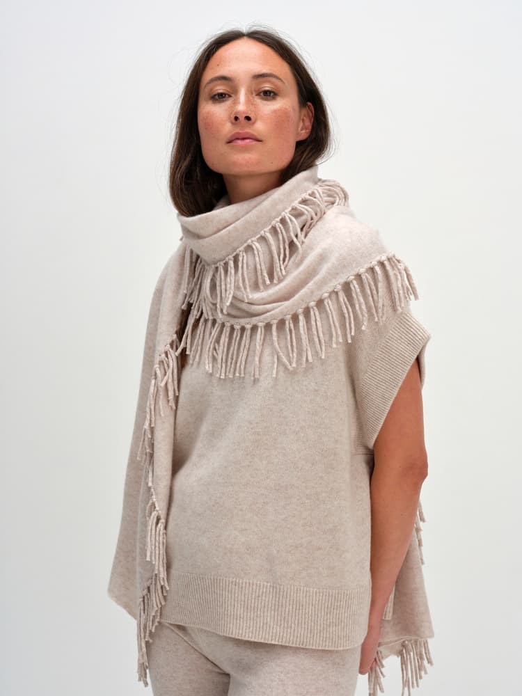 Our classic, but with fringes along the sides for an extra edge. Rectangular, plain knitted classic scarf. Big, warm and made of the softest cashmere.