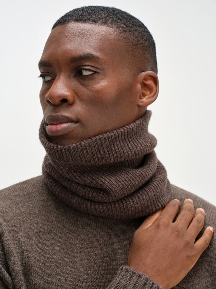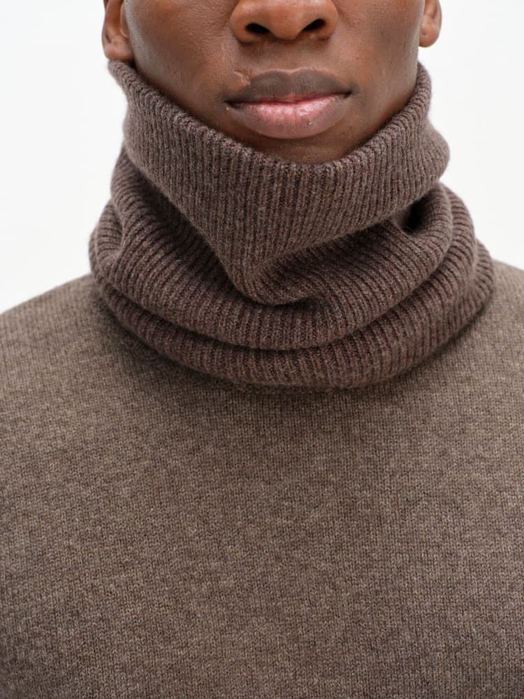 • Ribbestrikket buff. Strikket i doble lag og kan brukes på begge sider.