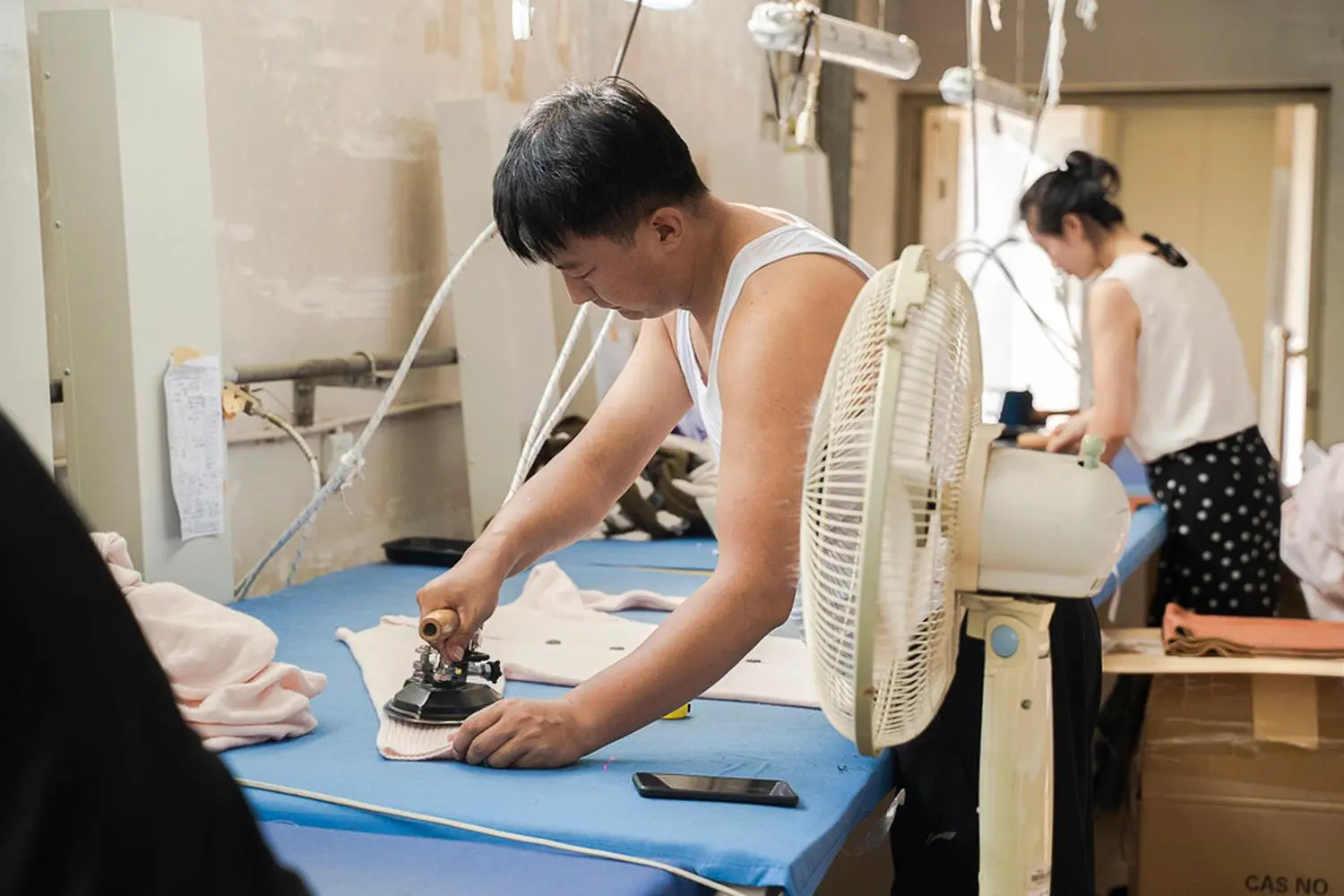 When the garment is fully assembled, it's washed and ironed with a steamer before a neck label, care label and size label are sewn on. The garments are then sent to us, and finally, home to our customers.