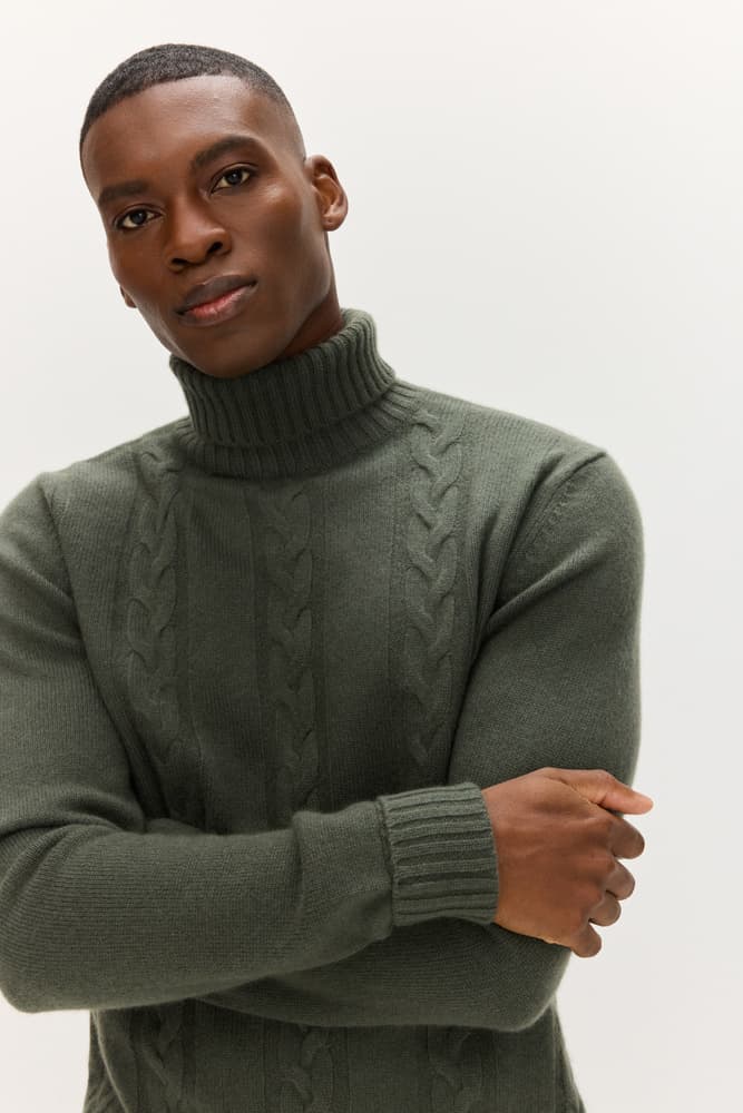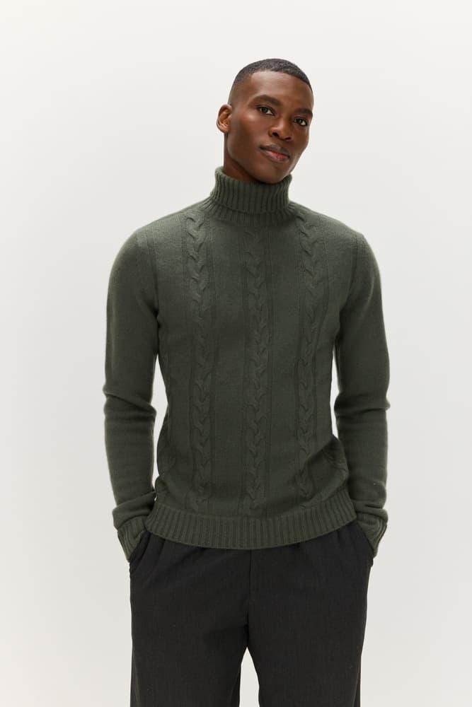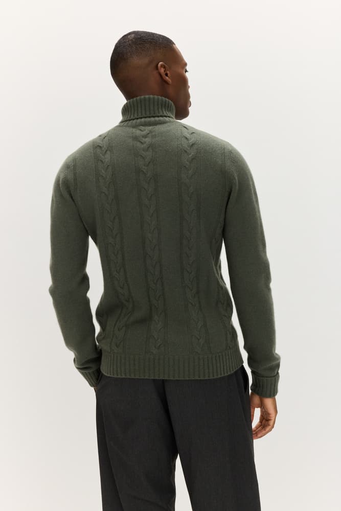 Cable-knitted turtleneck sweater with long sleeves. Ribbed hem and cuffs. Cable details on the front and back.