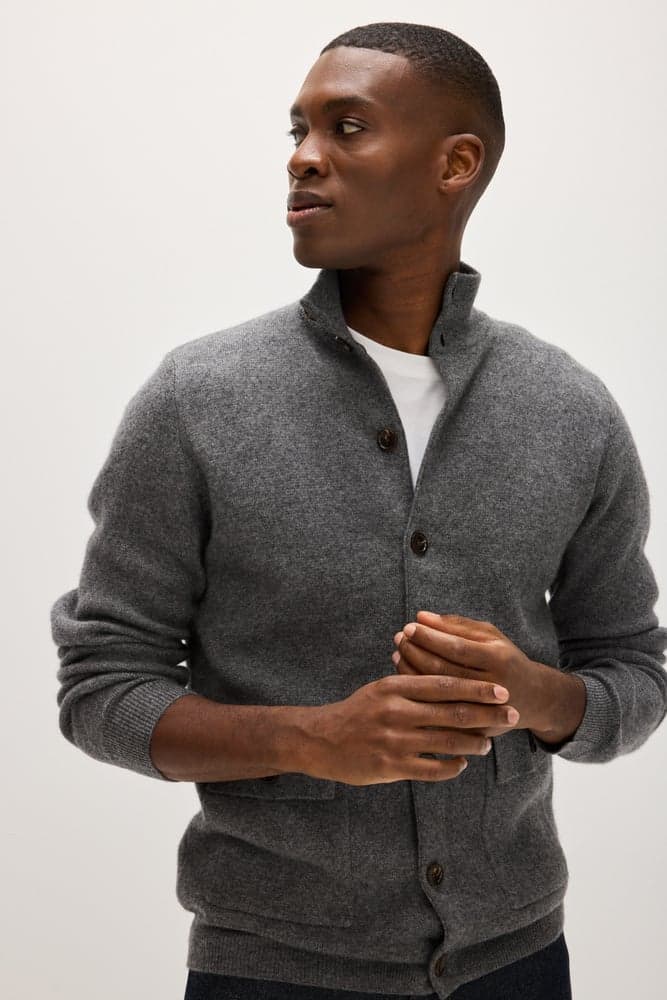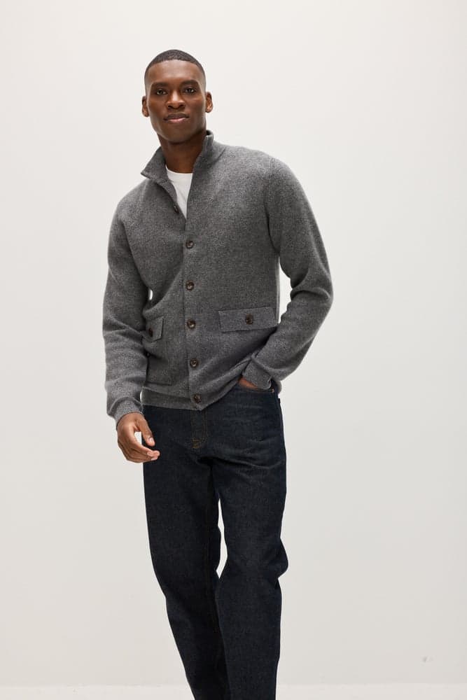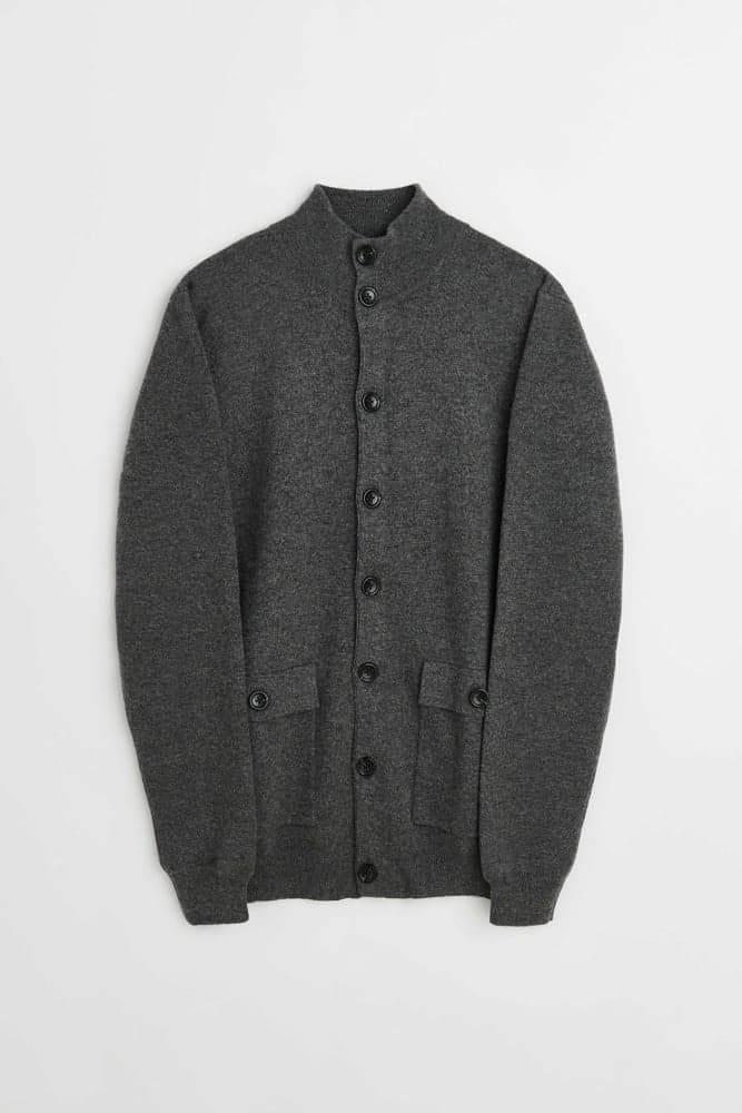 Cardigan with button front. Knitted using full needle-knitting. Ribbed hem and cuffs. Front pockets with pocket flaps.