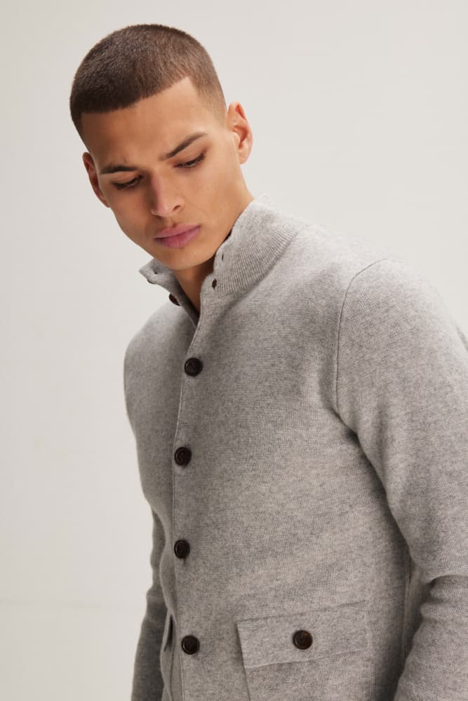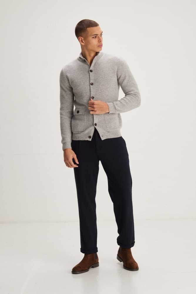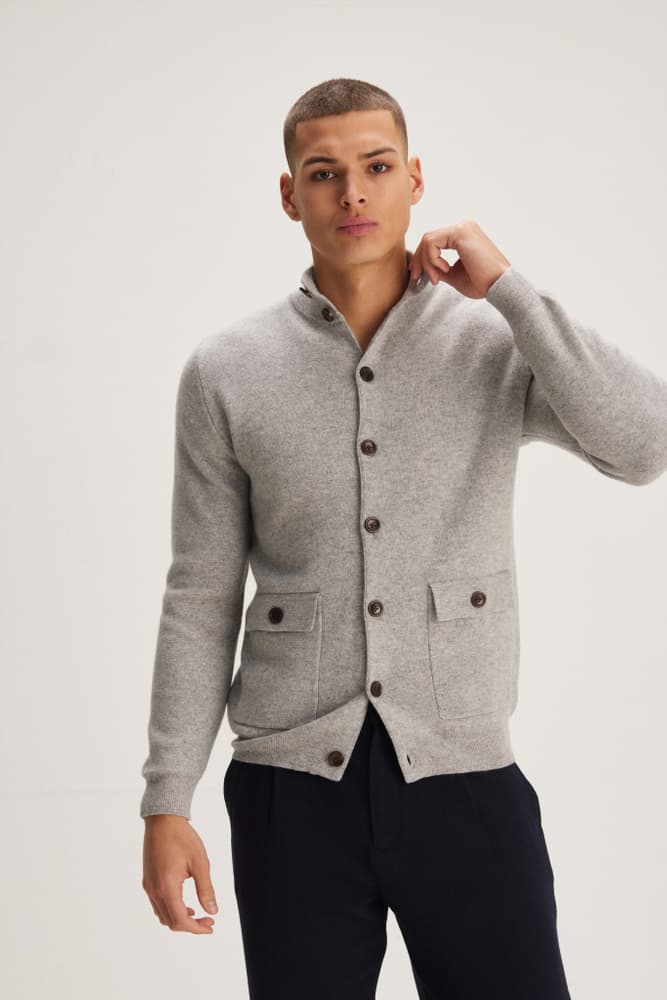 Cardigan with button front. Knitted using full needle-knitting. Ribbed hem and cuffs. Front pockets with pocket flaps.