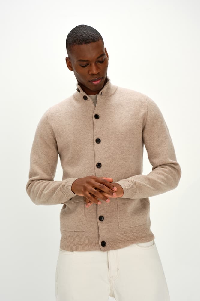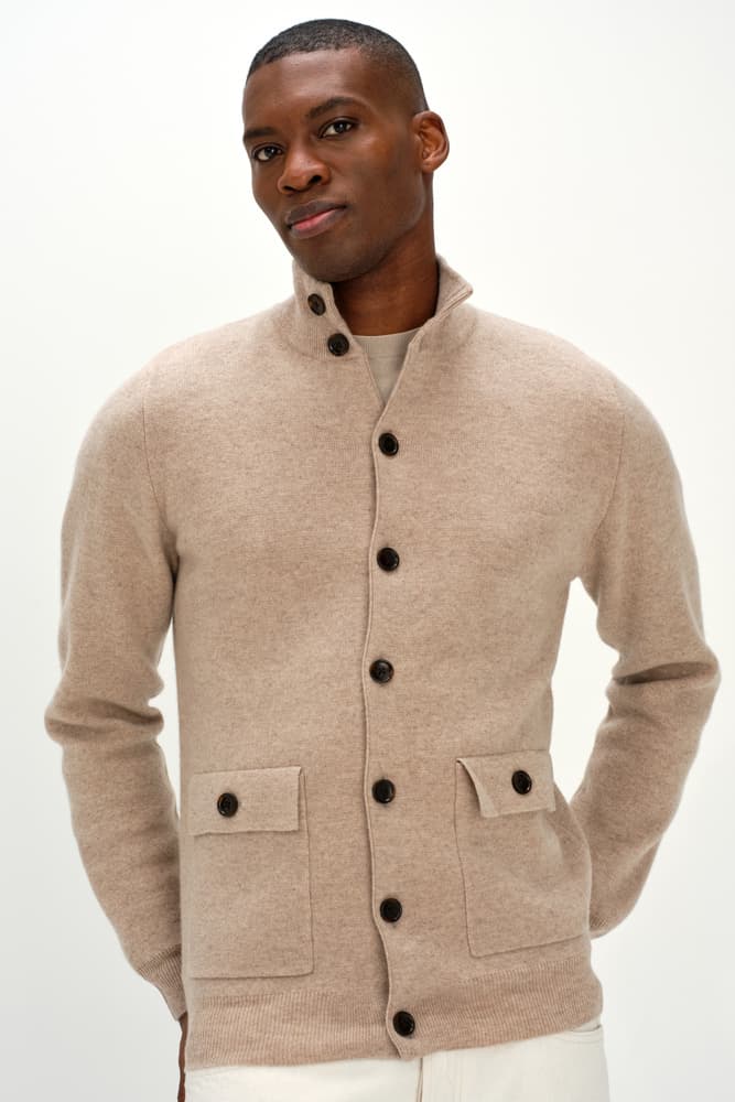 Cardigan with button front. Knitted using full needle-knitting. Ribbed hem and cuffs. Front pockets with pocket flaps.