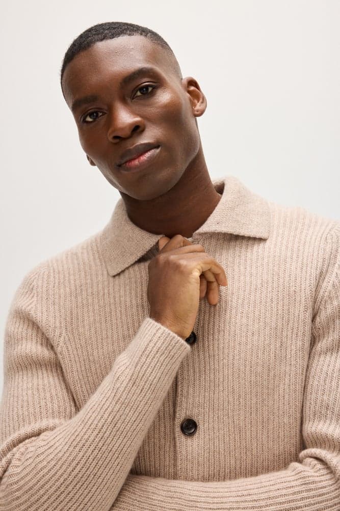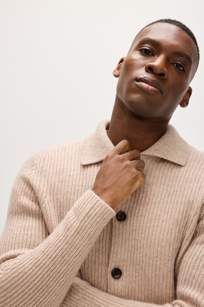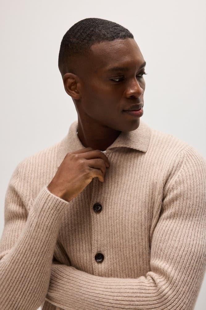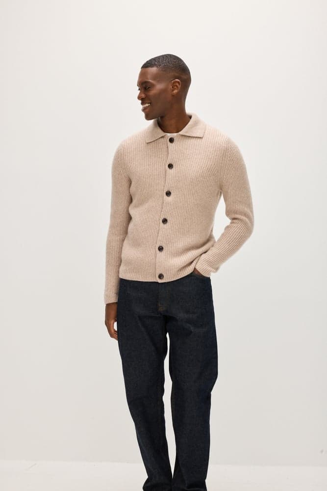 Cardigan with collar and thick rib-stitching. Long sleeves and button down front. Normal size and fit.