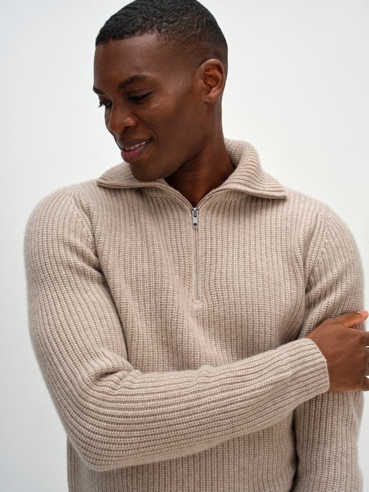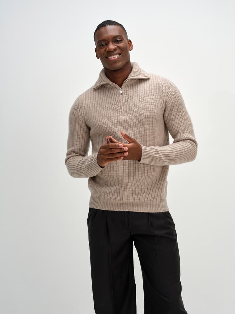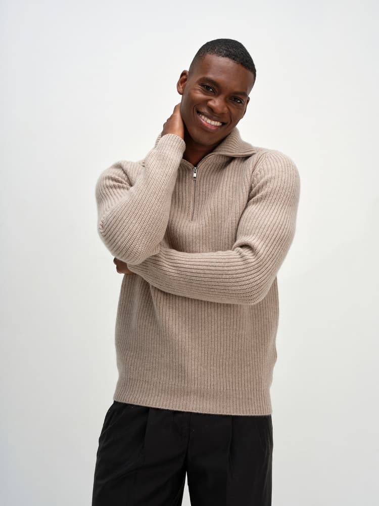 Heavy-knit sweater with short zip at the top and long sleeves. Double-knitted high collar that looks lovely folded up or over your shoulders.