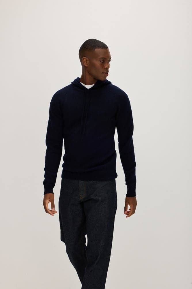 A chunkier knitted hoodie with a drawstring but without a front pocket. This offers a more dressed and clean look, yet a warm and comfortable garment.