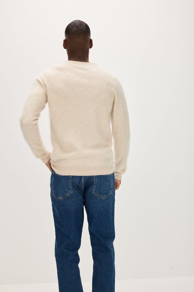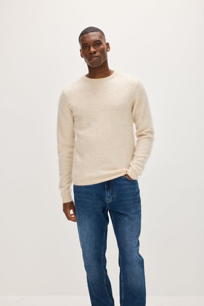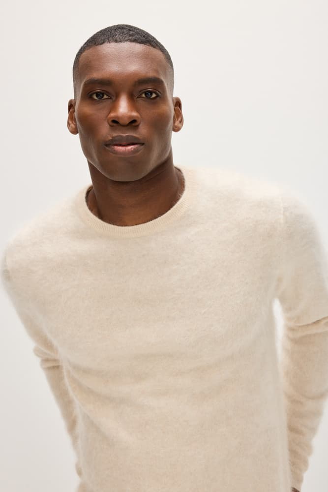 A brushed cashmere version of our slightly heavier sweater with a round neckline. Stylish detail with a distinctive rib at the neckline, cuffs, and bottom hem. True to size and fit.