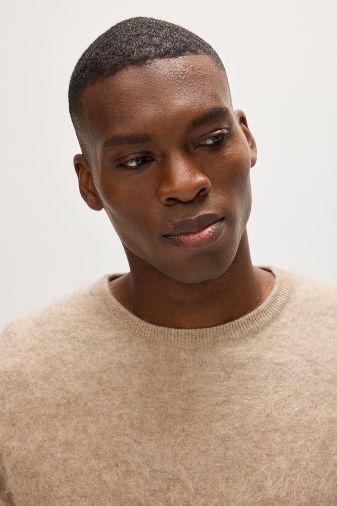 • A brushed cashmere version of our slightly heavier sweater with a round neckline. Stylish detail with a distinctive rib at the neckline, cuffs, and bottom hem. True to size and fit.