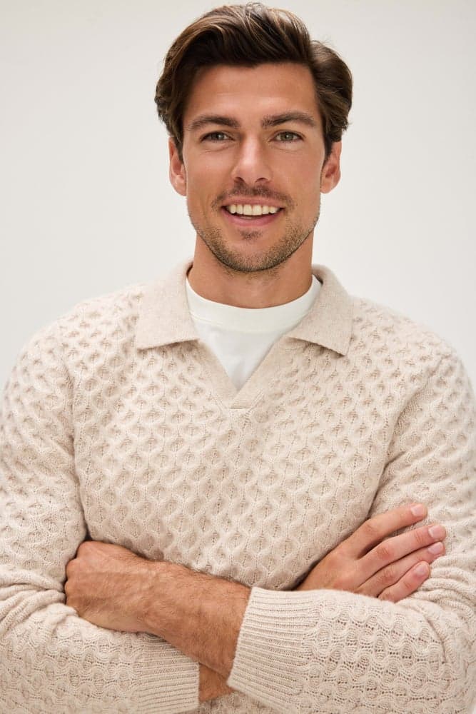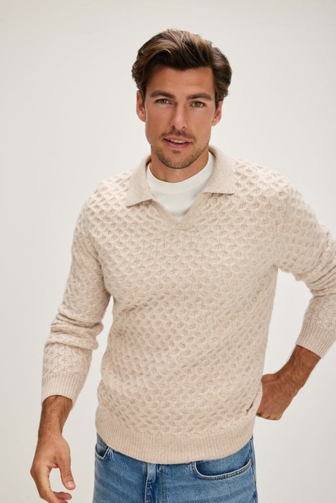 A sweater with an open collar, knitted in a geometric pattern resembling squares or diamonds all over.Read more
