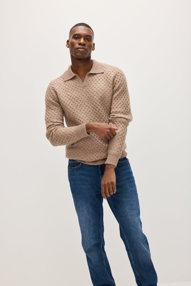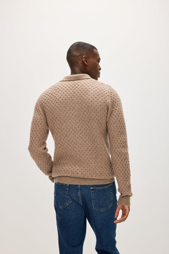 A sweater with an open collar, knitted in a geometric pattern resembling squares or diamonds all over.Read more