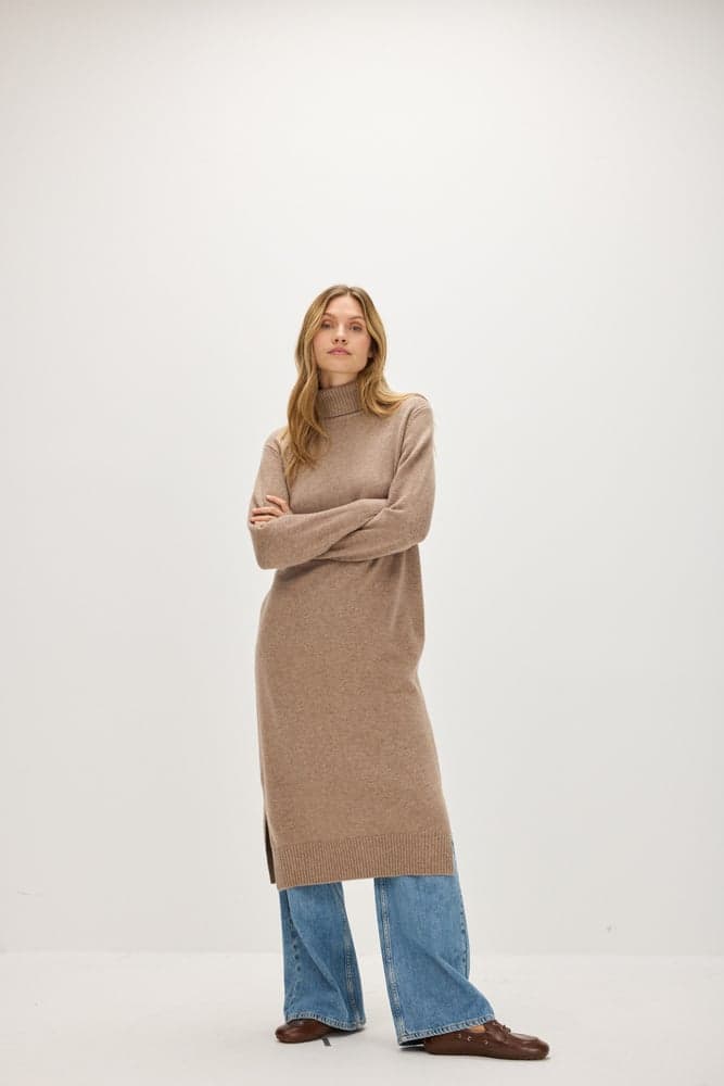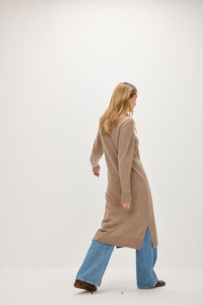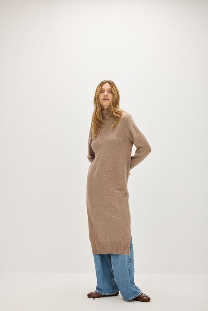 Flat-knitted midi dress. Slits on both sides. Ribbed hem and cuffs. Long sleeves.