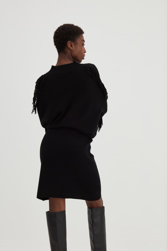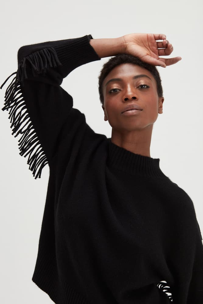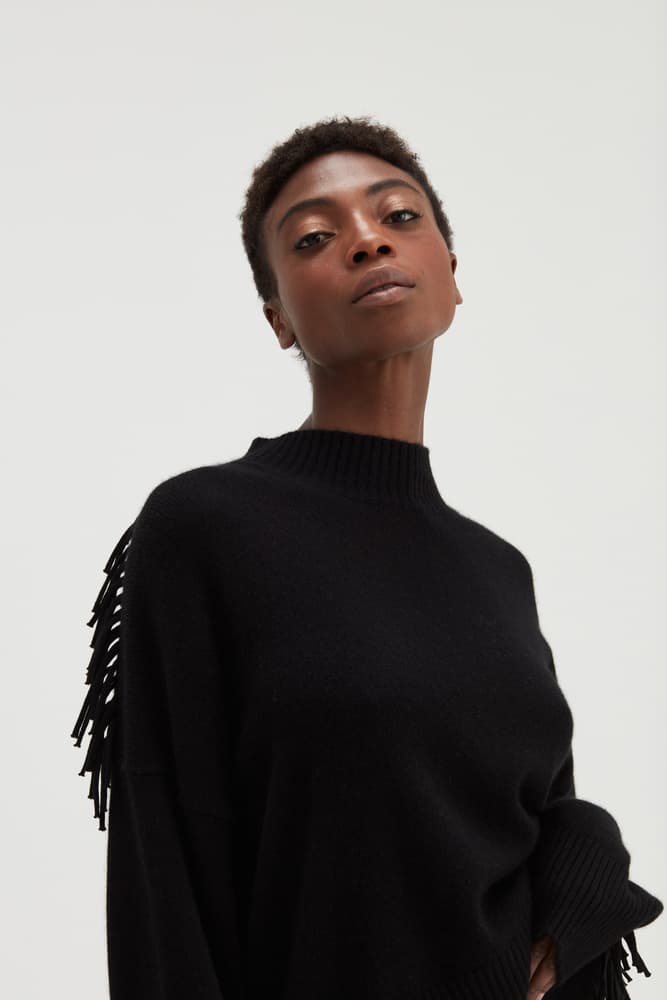 Our new favorite - but with fringes! A straight sweater with a boxy cut. Wide fit with long sleeves and extended shoulders. Round neckline. Elastic knit at the cuff and at the bottom. Fringes on shoulders and lower arms.