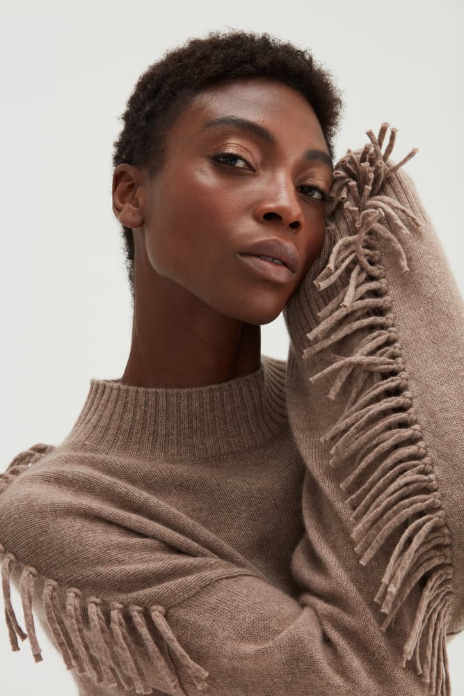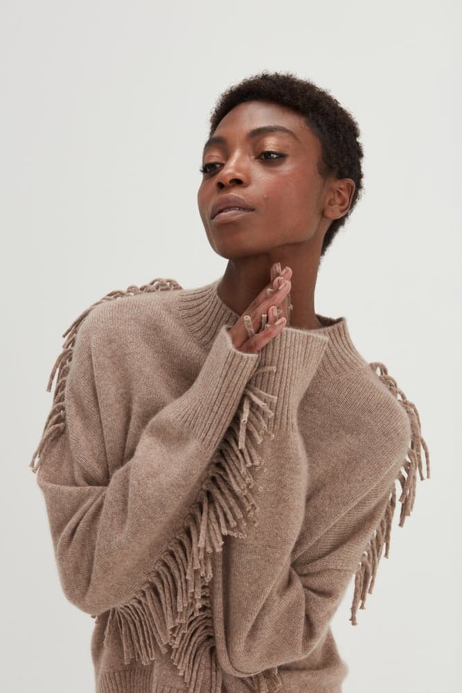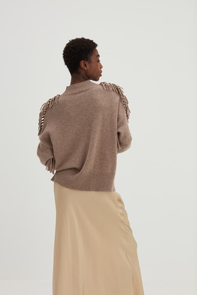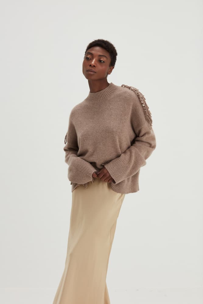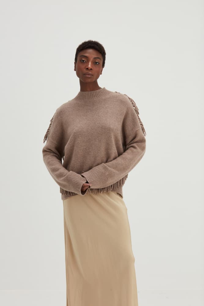 Our new favorite - but with fringes! A straight sweater with a boxy cut. Wide fit with long sleeves and extended shoulders. Round neckline. Elastic knit at the cuff and at the bottom. Fringes on shoulders and lower arms.