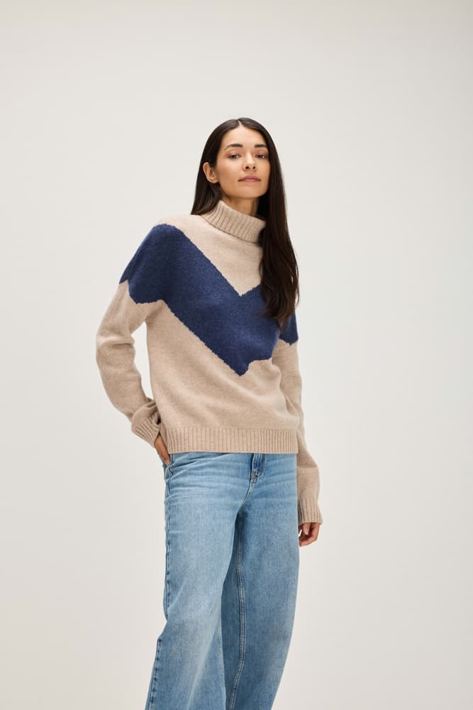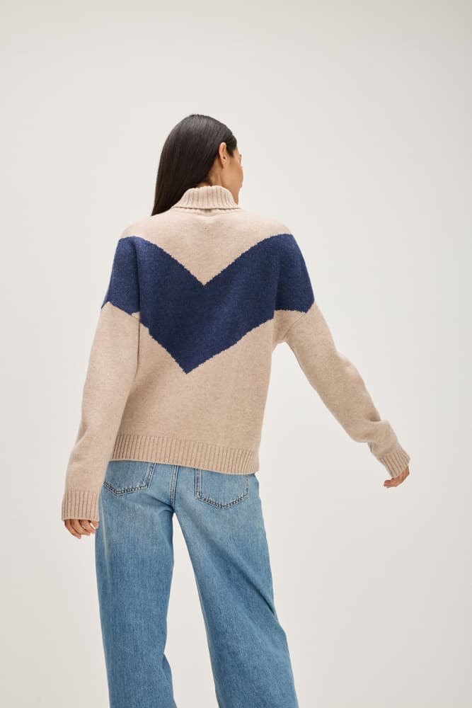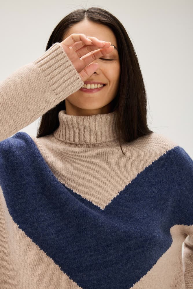 Knitted oversize sweater with a V in a contrasting color on the chest. Elastic knitting at the cuffs and bottom and elastic knitted high polo collar. Dropped shoulders. Long fit and rounded back.