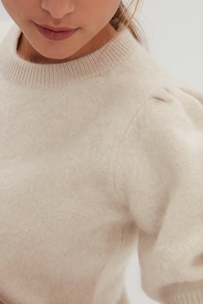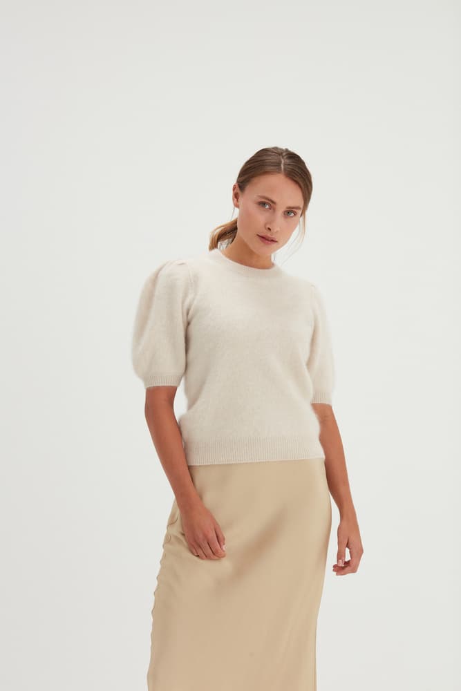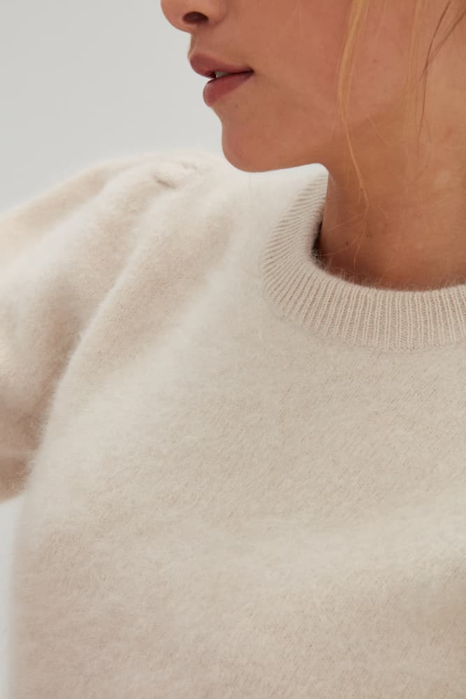 Chunky knit top with short sleeves. The t-shirt has puff details on the shoulders. Round neck and short fit with ribbed hem.
