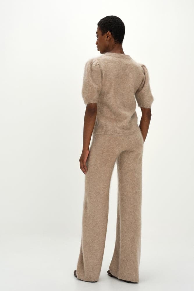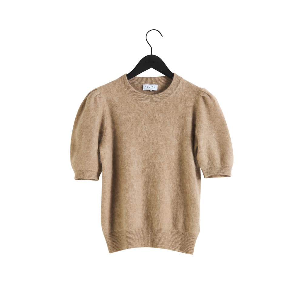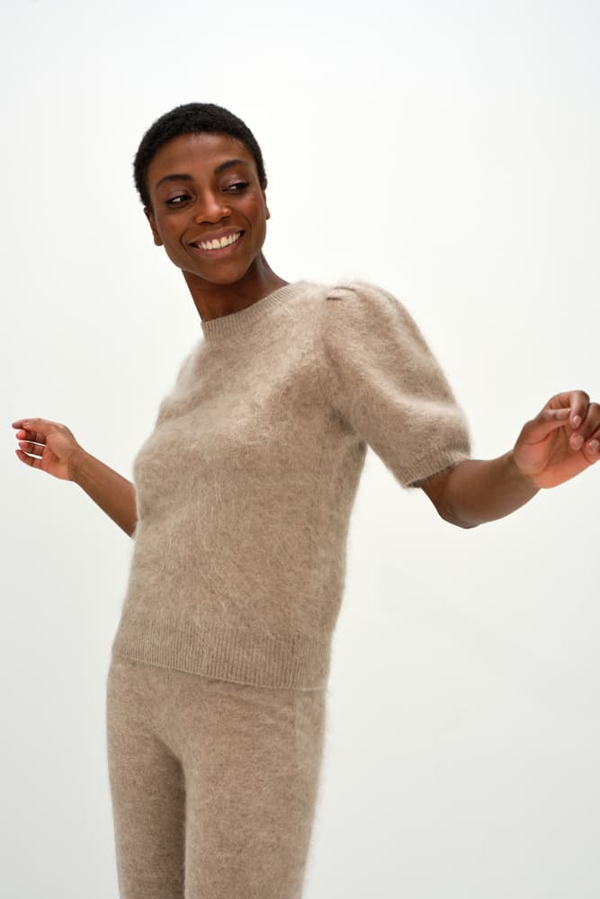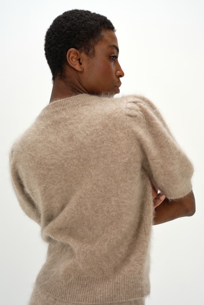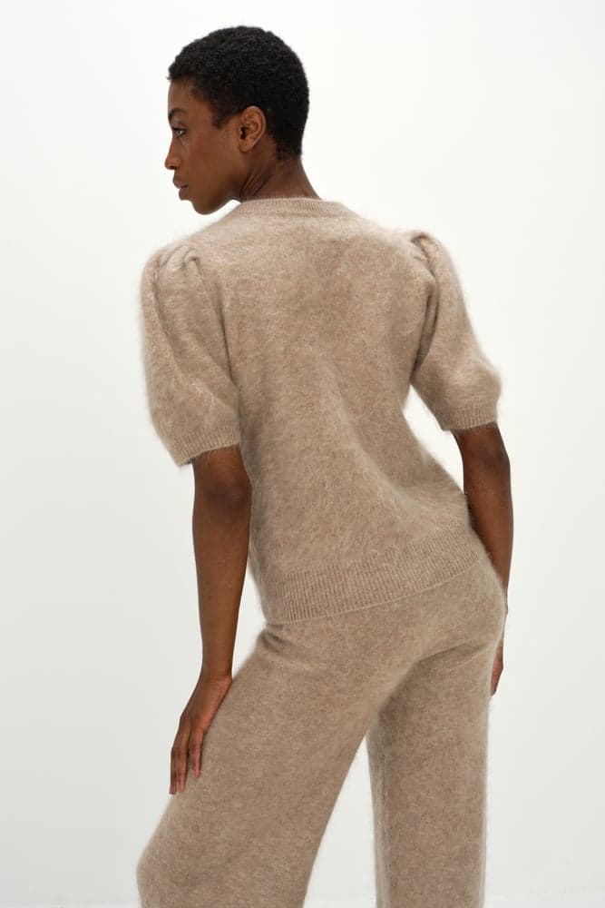 - Made of super soft brushed cashmere that has an hairy and fluffy texture. It has a very luxurious sheen to it. - Chunky knit top with short sleeves. The t-shirt has puff details on the shoulders. Round neck and short fit with ribbed hem. - If you're not sure what size to choose, see our size guide. - 12 gauge