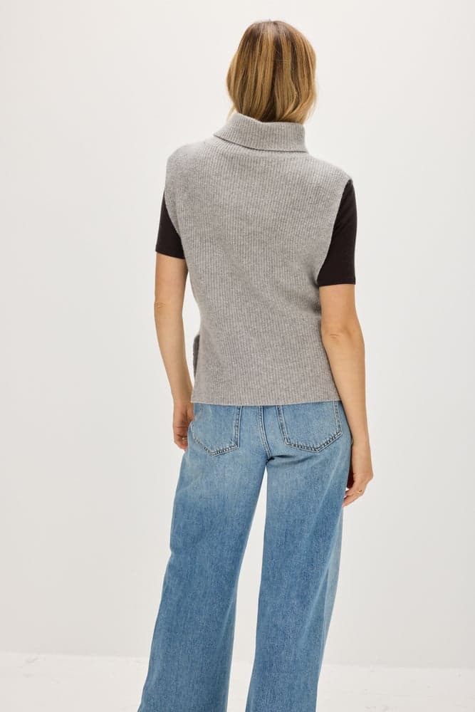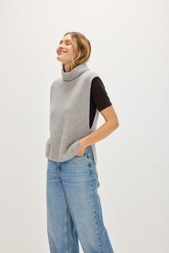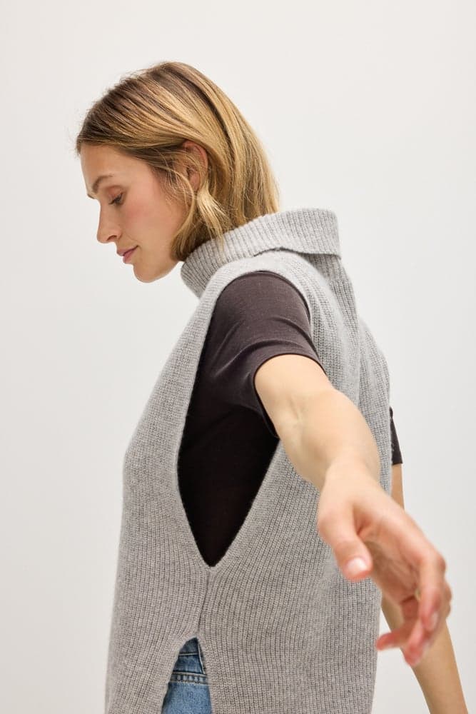 Ribbed vest with turtleneck and mid length. Open on the sideds with only a small part connected between the front and the back piece.