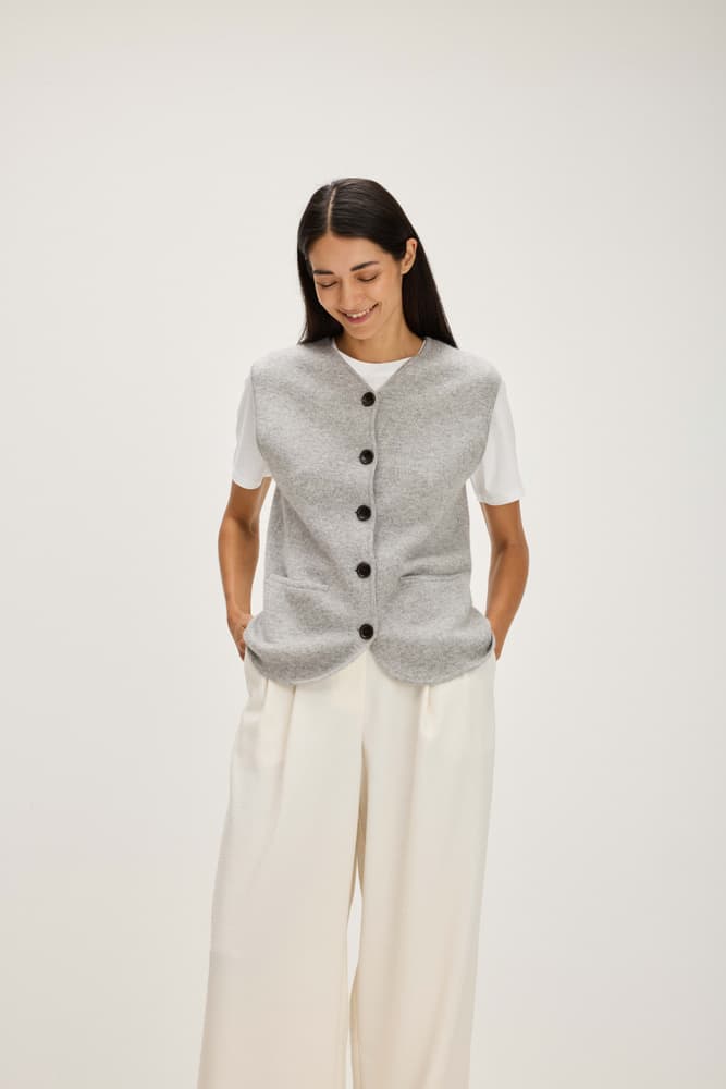 A straight hip-long vest with black buttons and pockets on both sides. V-neck with an even edge and straight cut.