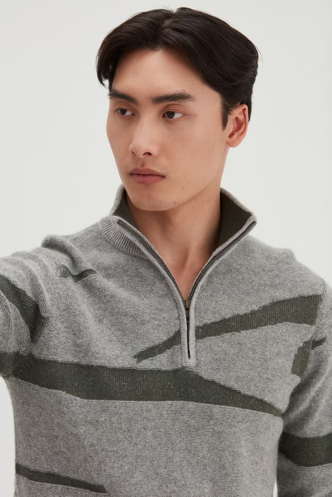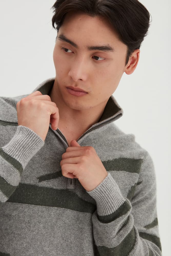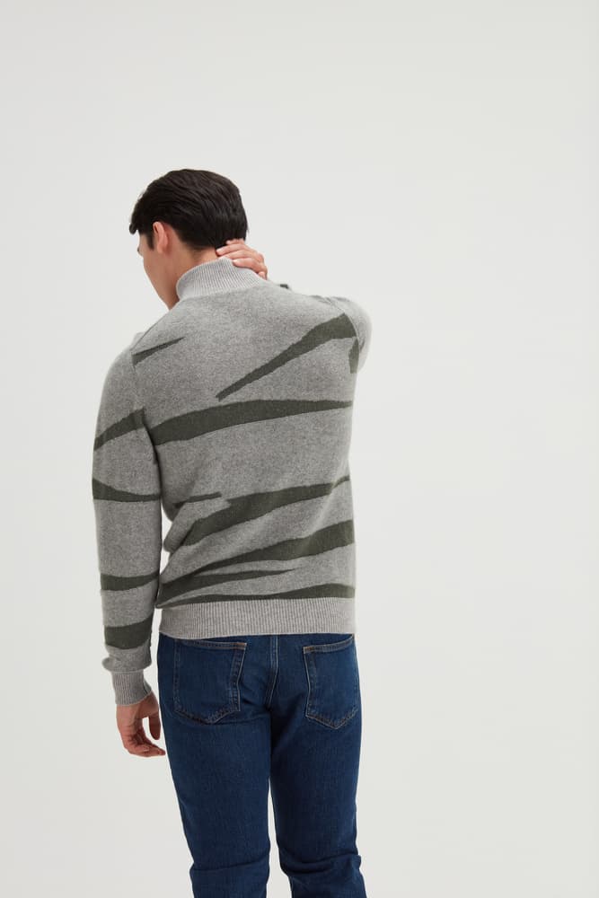 En strukturerad stickad tröja med en kort dragkedja upptill. Kontrasterande färg under kragen och i det kamouflagemönstrade mönstret. Ribbstickad i båda ärmsluten och i nederkanten. Passform och storlek stämmer.