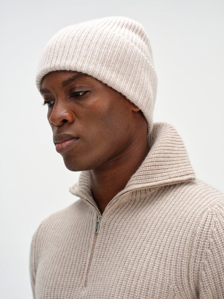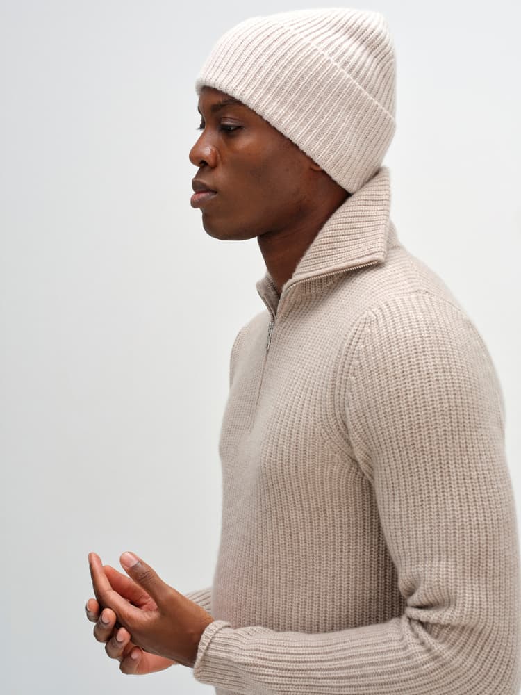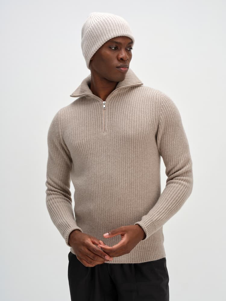 En tjock ribbstickad modell med högt uppvik.