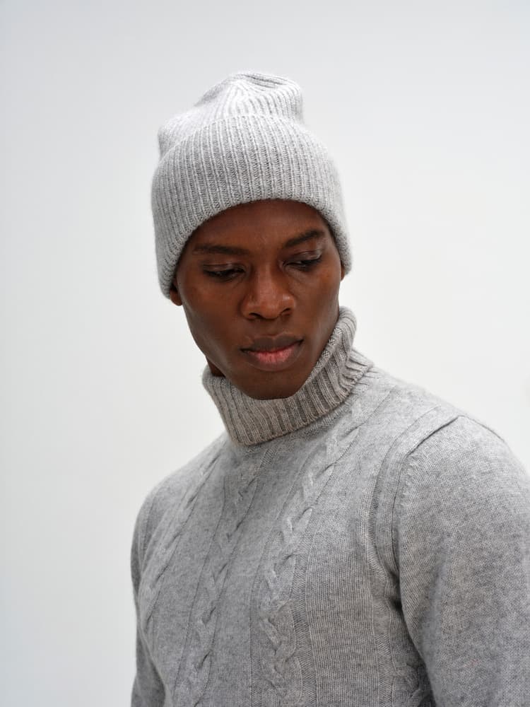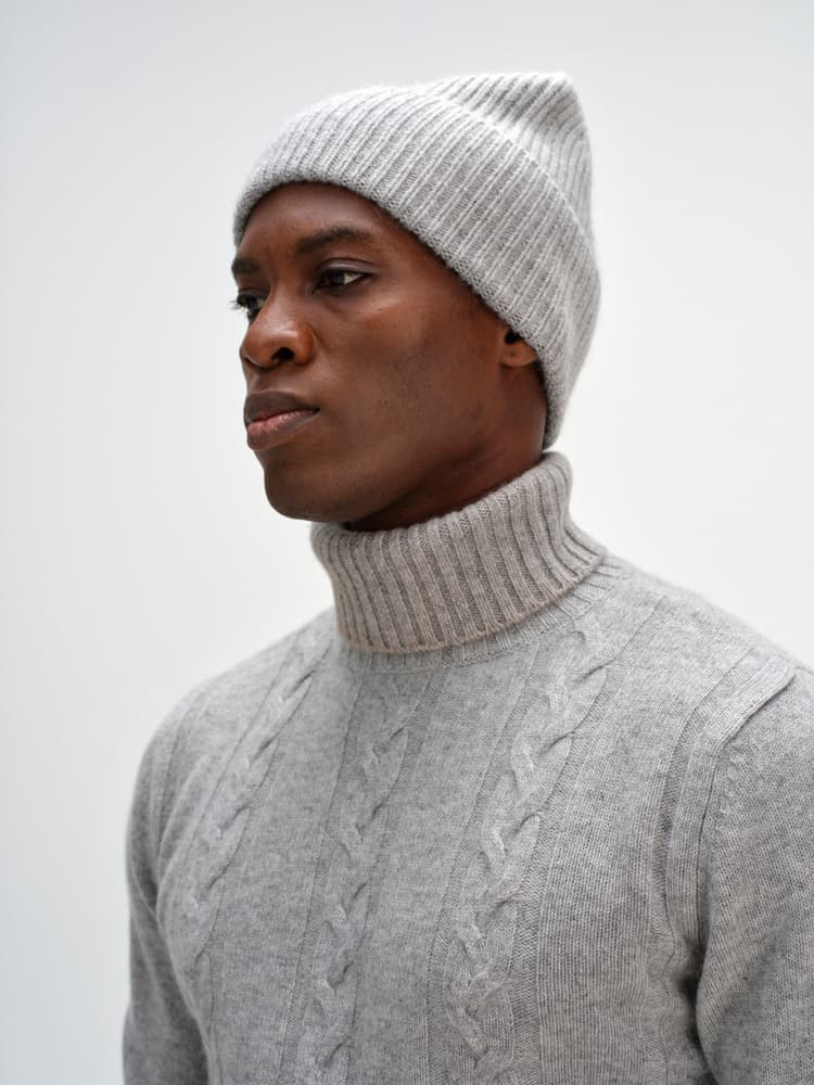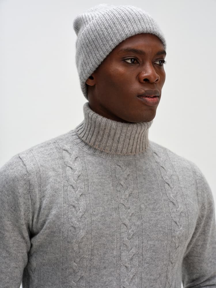 En tjock ribbstickad modell med högt uppvik.