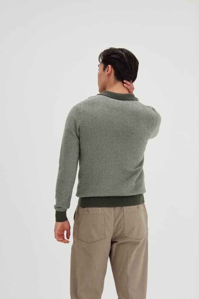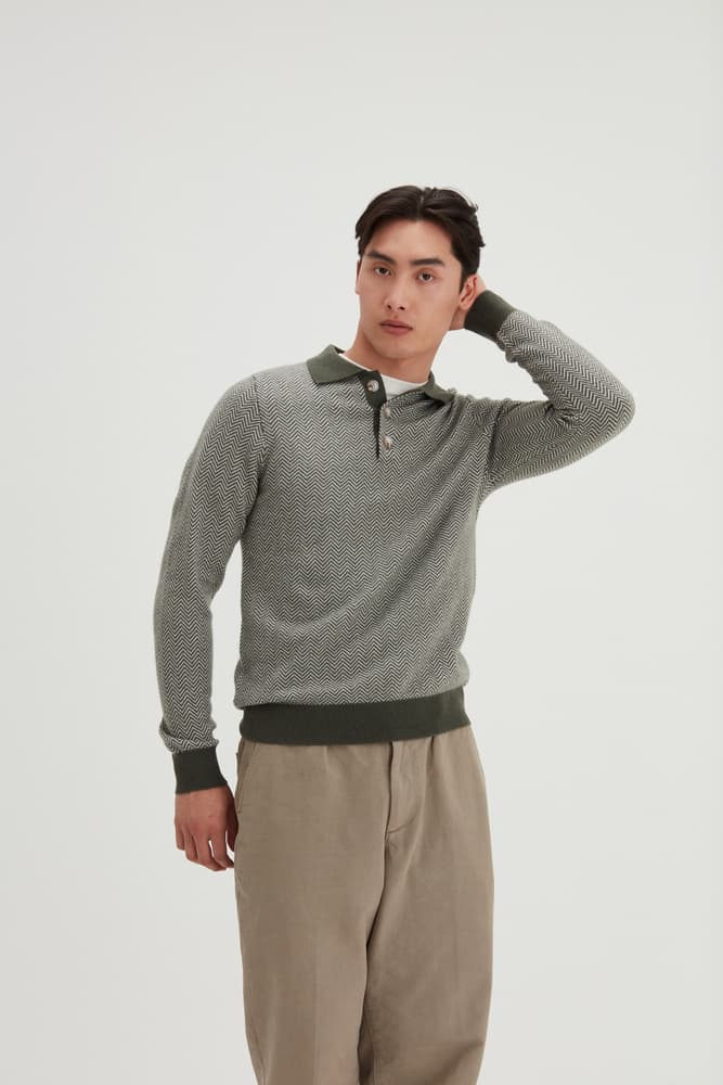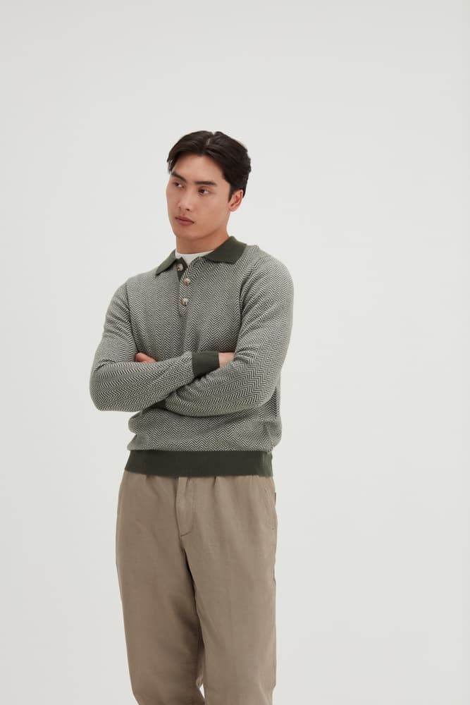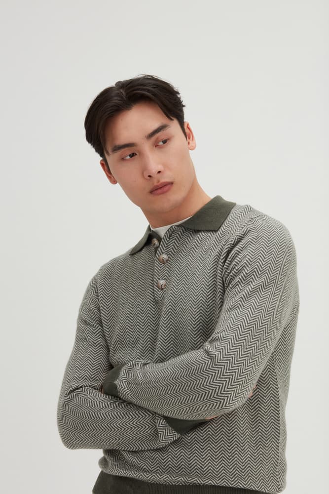 Vår bästsäljande Man Collar, men nu med fiskbensmönster. En långärmad tröja som med sin krage och sina knappar passar bra till nästan alla tillfällen. Enkelstickad och har en standardpassform.