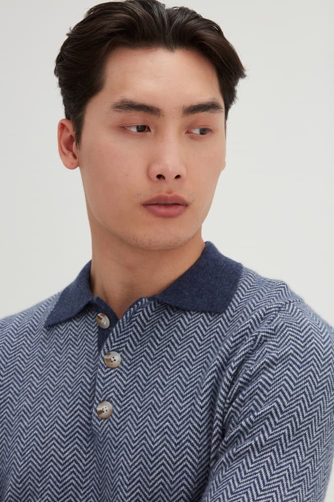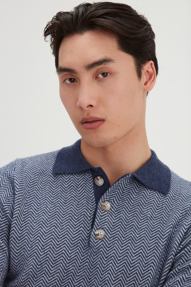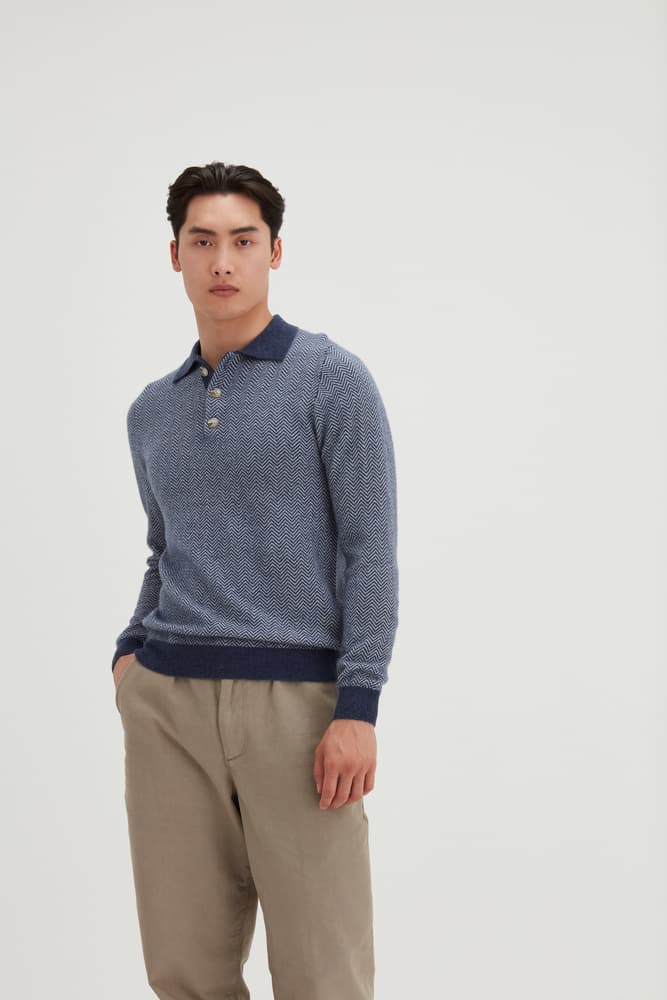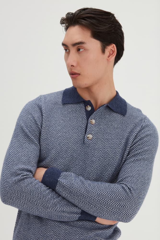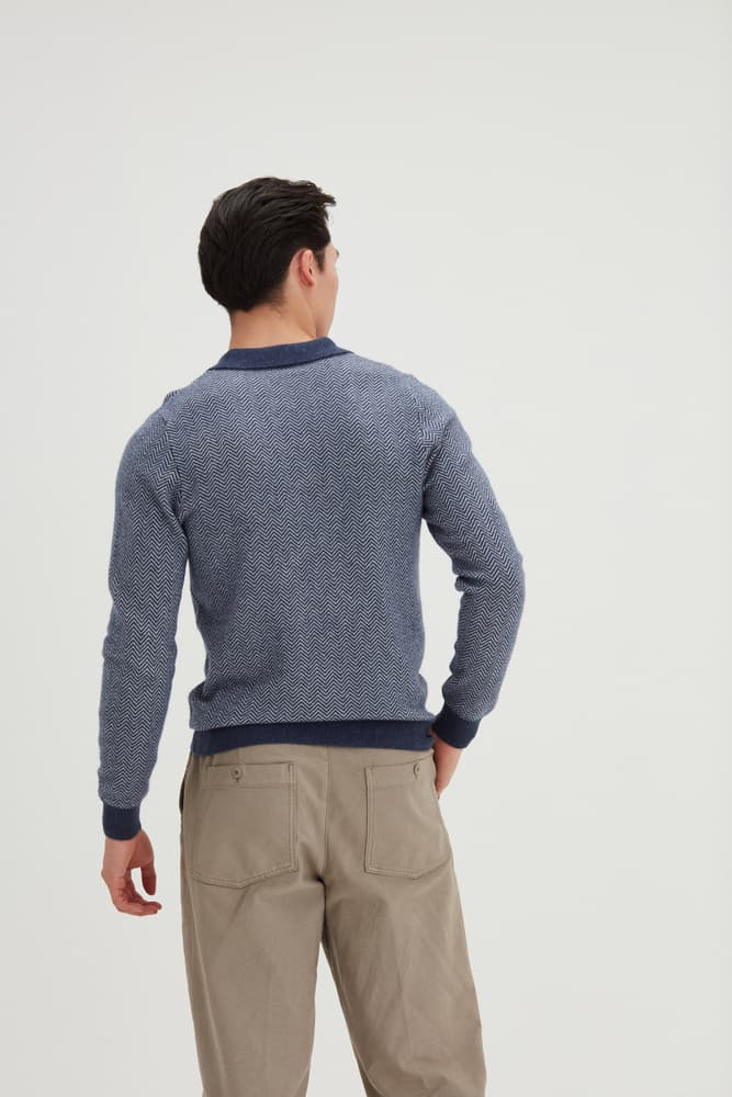 Vår bästsäljande Man Collar, men nu med fiskbensmönster. En långärmad tröja som med sin krage och sina knappar passar bra till nästan alla tillfällen. Enkelstickad och har en standardpassform.