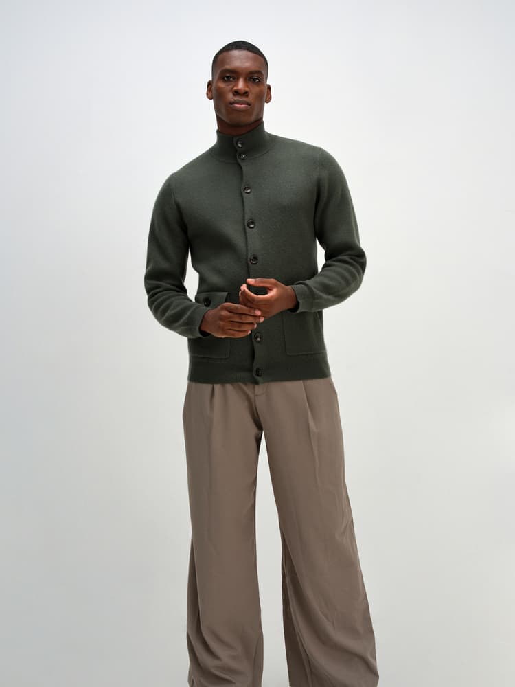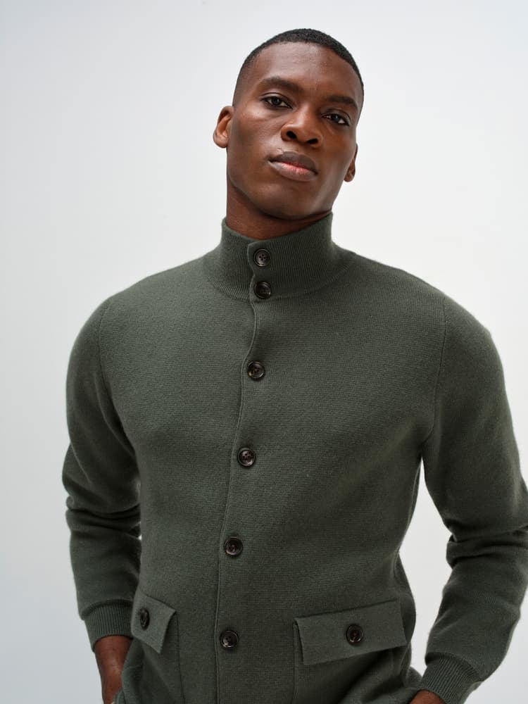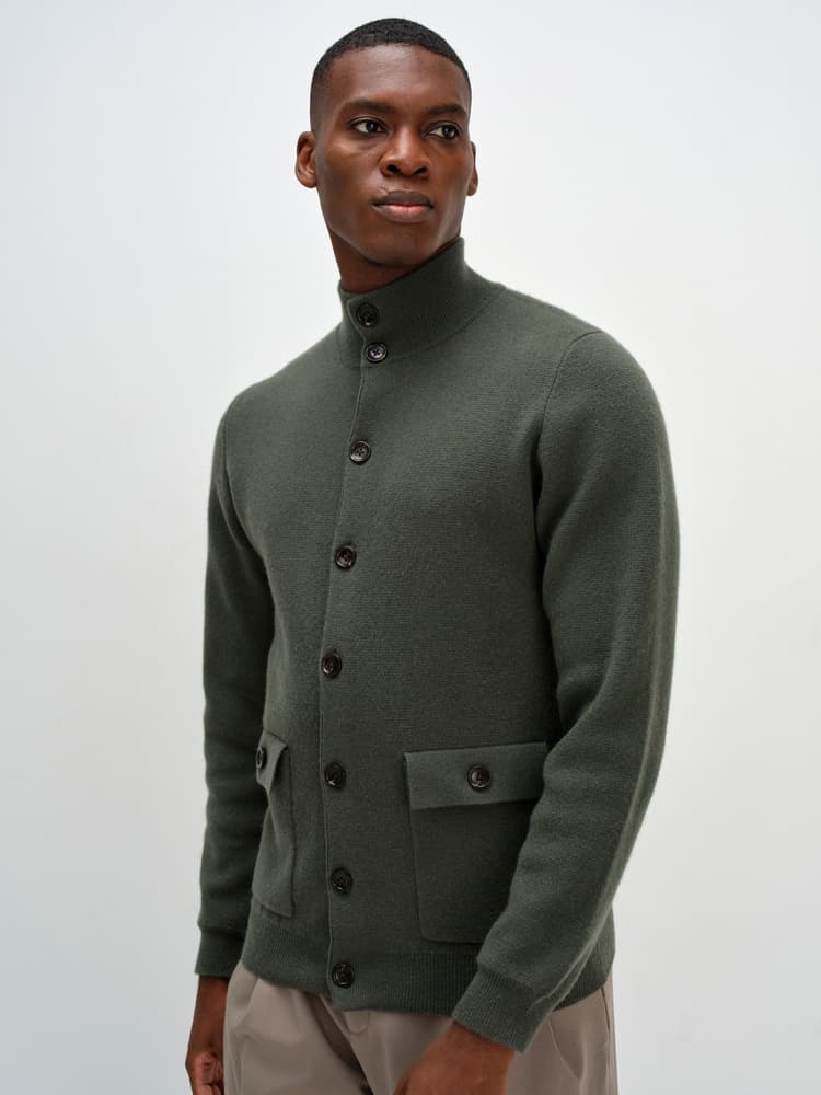 Stickad kofta med knäppning framtill. Stickad i s.k fullneedle-stickning. Högre krage i resårstickning. Resårstickad mudd nedtill samt i ärmslut. Fickor med ficklock framtill.