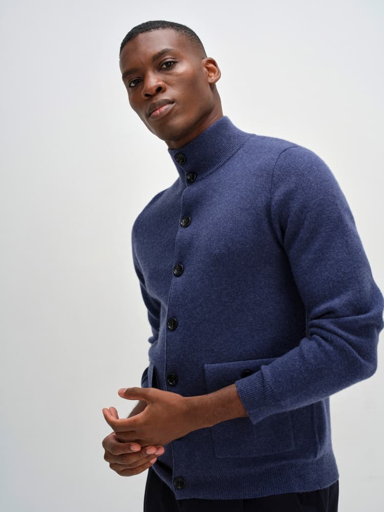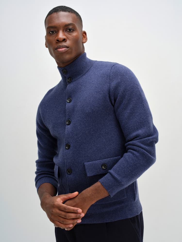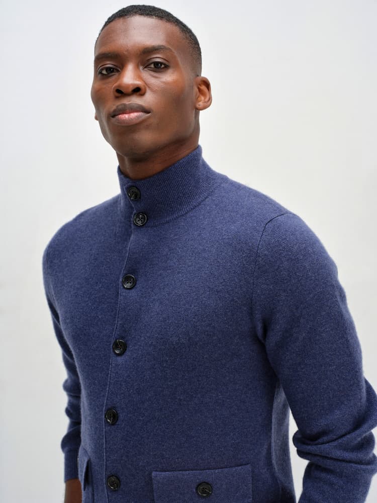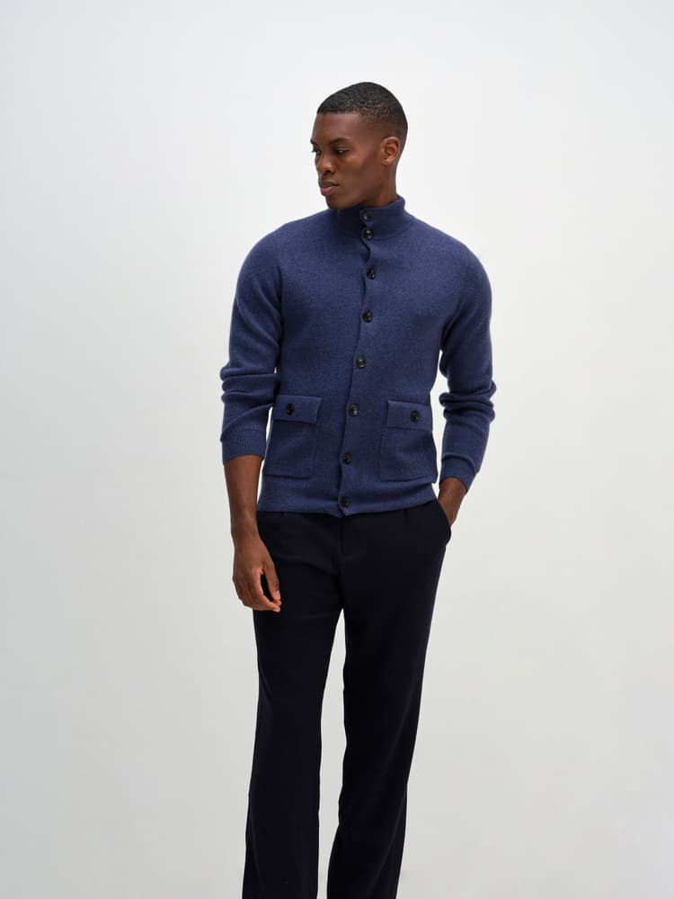 Stickad kofta med knäppning framtill. Stickad i s.k fullneedle-stickning. Högre krage i resårstickning. Resårstickad mudd nedtill samt i ärmslut. Fickor med ficklock framtill.